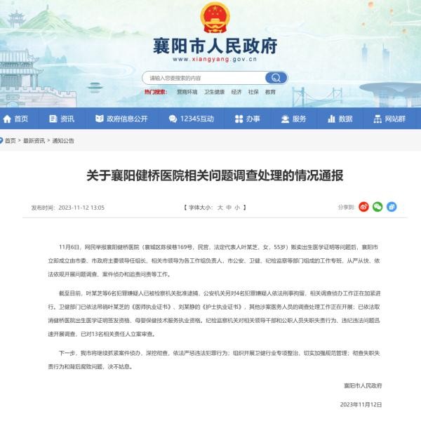 香港新聞網11月12日電 11月12日,湖北省襄陽市人民政府發布通報稱,11月6日,網民舉報襄陽健橋醫院(襄城區陳侯巷169號,民營,法定代表人葉某芝,女,55歲)販賣出生醫學證明等問題後,襄陽市立即成立由市委、市政府主要領導任組長、相關市領導為各工作組負責人,市公安、衛健、紀檢監察等部門組成的工作專班,從嚴從快、依法依規開展問題調查、案件偵辦和追責問責等工作。