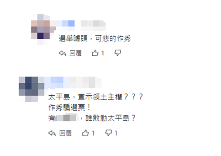 有網友認為台“立委”擬12月前往太平島考察是在“作秀”,他們稱,“選舉噱頭,可悲的作秀”“作秀騙選票!有大陸在,誰敢動太平島?”
