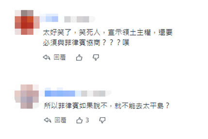 對於台當局前往太平島宣示主權需要跟菲律賓協商一事,有網友諷刺,“太好笑了,笑死人,‘宣示領土主權’,還要必須與菲律賓協商?”還有網友發問,“所以菲律賓如果說不,就不能去太平島?”