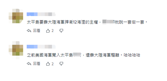 有網友提到日前美軍與解放軍驅逐艦先後出現在太平島附近海域一事。網友稱,“之前美國海軍開入太平島附近海域,還靠大陸海軍驅離。”網友還稱,“太平島要靠大陸海軍捍衛12海里的主權,台防務部門說一套做一套。”