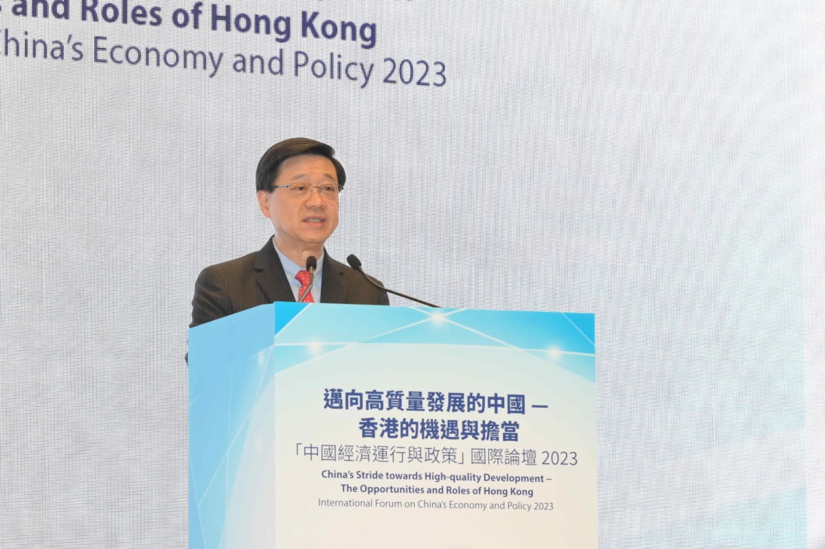 行政長官李家超今日在邁向高質量發展的中國──香港的機遇與擔當“中國經濟運行與政策”國際論壇2023致辭。圖自港府新聞處 該論壇由香港特區特首政策組、香港中國學術研究院和中國社會科學院財經戰略研究院聯合主辦,以“邁向高質量發展的中國──香港的機遇與擔當”為主題。 李家超指出,根據國家統計局發佈的最新數據,今年前三季,國家的國內生產總值較去年同期增長5.2%,並有望實現全年增速5%的預期目標。高技術製造業投資和高技術服務業投資,分別較去年同期增加11.3%和11.8%,持續推動產業轉型升級。這些數據顯示國家正邁向中國式現代化和高質量發展的康莊大道,前景欣欣向榮。 李家超表示,剛剛在北京舉行的中央金融工作會議強調要鞏固提升香港國際金融中心地位,不但展現中央政府對香港國際金融中心地位的高度肯定,更加彰顯國家對香港開創金融高質量發展局面,實現新飛越,寄予厚望。香港定當繼續發揮所長,鞏固和落實國家“十四五”規劃之下的八大中心定位,積極招商引才,拓展經貿網絡,在保持高度國際化的同時,更加主動融入國家發展大局,貢獻粵港澳大灣區建設和“一帶一路”倡議的國家戰略,為經濟注入動能。 在最新一份施政報告中,李家超提出以產業導向為政策,通過體系建設,推進以結果為目標的新管治文化和加強協作,將有為政府和高效市場更好結合。他表示,除了鞏固各項優勢產業以外,特區政府也會積極發掘新增長點,推動創新科技,包括醫藥研發,新能源交通等新興產業,維持香港的競爭力,促進經濟多元發展。(完) 【編輯:陳偉根】