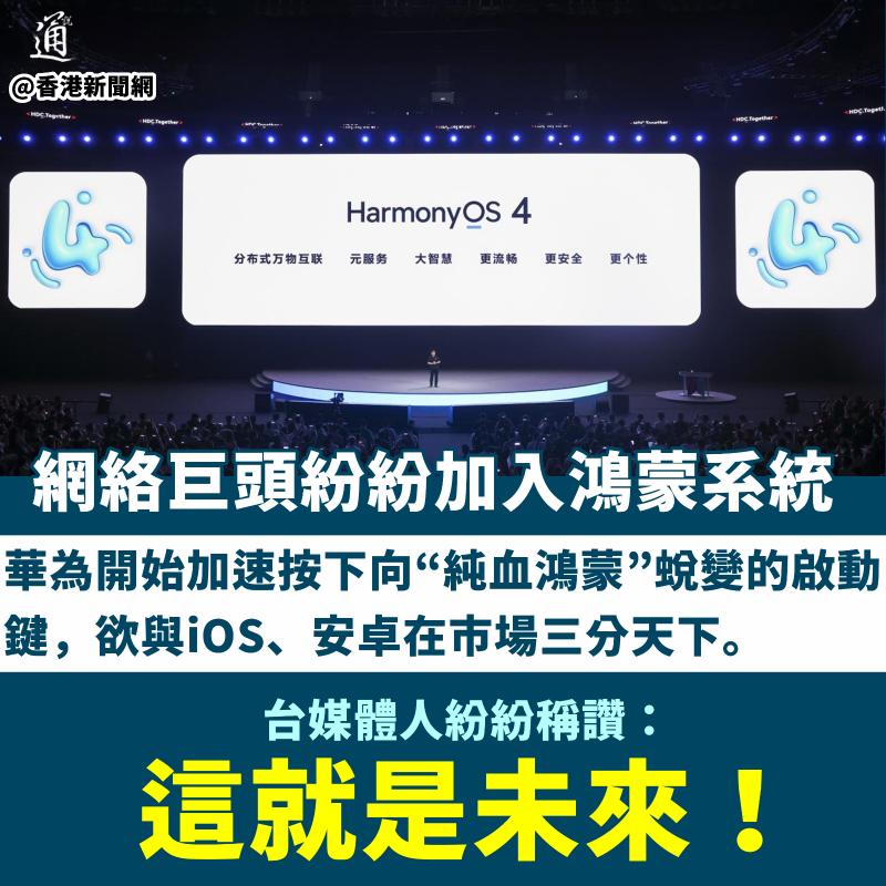香港新聞網11月17日電 繼Mate 60驚艷亮相之後,華為又有大動作了! 在下一版本鴻蒙不再兼容安卓系統後,近日,華為重磅宣布與美團以HarmonyOS(鴻蒙系統)為基礎進行產業創新、技術應用、商業發展等方面展開全面合作,全力支持美團啟動開發鴻蒙原生應用工作。還有網易、今日頭條、釘釘等多家互聯網頭部企業,包括文旅、遊戲等類別的公司也紛紛入列,加入鴻蒙的開發大軍。 華為開始加速按下向“純血鴻蒙”蛻變的啟動鍵,欲與iOS、安卓在市場三分天下。 對此,台灣不少資深媒體人紛紛稱讚:華為就是未來! 網絡巨頭為何紛紛加入鴻蒙系統?台灣教授賴岳謙教授解釋道,中國大陸很多企業都清楚地知道,如果繼續依賴美國的這些作業系統生態系統,如果美國有一天也要制裁他們,將會產生很嚴重的後果。所以,這些企業要去風險化,要未雨綢繆,讓華為的這個鴻蒙系統更加的強壯。