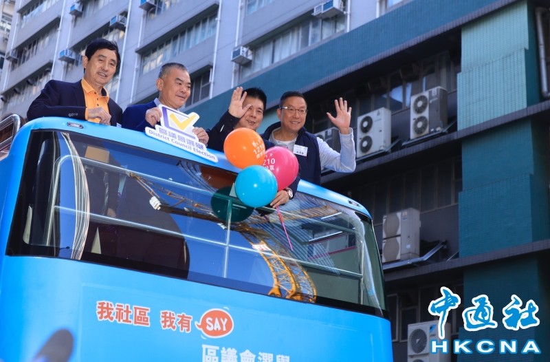 香港中通社圖片 當天早上,由香港義工聯盟主辦、香港友好協進會、香港青少年愛國主義教育基金會合辦及香港廣東社團總會、香港福建社團聯會等26家香港省級同鄉社團協辦的“我社區 我有SAY 齊投票”區議會選舉宣傳巡遊活動,舉行啟動禮。 全國政協常委、香港義工聯盟主席譚錦球在啟動禮上致辭時說,這次區議會選舉正在如火如荼進行,旗海處處、氣氛熱烈。 他說,這次區議會突顯三大特點,一是從制度的根本上消除區議會泛政治化弊端,讓區議會不再淪為反中亂港政棍操控的平台,重回選賢舉能的職能初心;二是充分體現以民為本的優質民主,讓獲選區議員能夠專注於履職盡責、為民謀福而非無謂的政治爭鬥;三是體現了公平公正、廣泛參與、多元組成,參選人均為愛國愛港有志之士,有熱忱服務社區、服務市民的心,尤其是很多年輕新面孔,讓大家看到香港有未來,看到青年強則香港強、祖國強的美好願景正在逐步實現。 啟動禮後,來自各社團的負責人登上觀光巴士從荔枝角出發,途經旺角抵達尖沙咀,向市民派發印有宣傳投票的氣球,呼籲大家於12月10日區議會選舉投票日齊盡公民責任,踴躍投票。(完) 【編輯:彭玉婷】