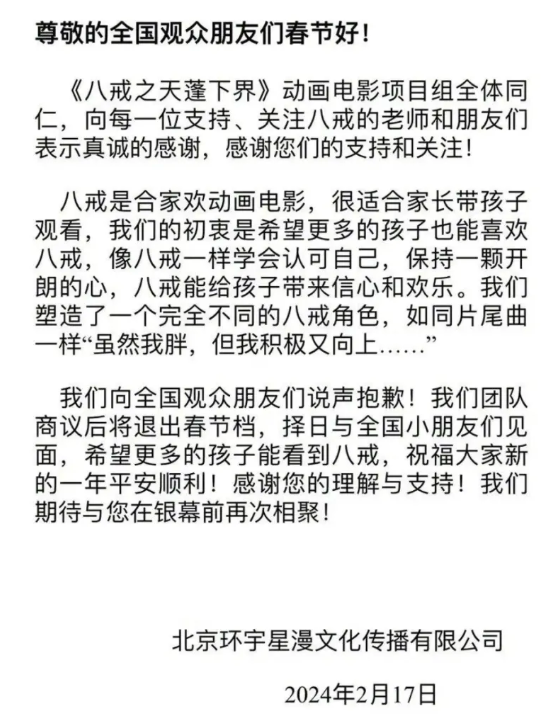 《八戒之天蓬下界》宣布退出春節檔。 今年春節國內賀歲片競爭實在激烈,九部電影同時上映,但票房除了前三部數據還好看外,另外幾部純屬陪跑。以前的春節檔,撲了就是撲了,現在的春節檔,撲了還可以撤檔! 看看這年年的春節檔,現在是怎麼變成的修羅場?2月14日晚,聯瑞影業官方宣布,春節檔在映電影《我們一起搖太陽》在檔期選擇上出現了重大失誤,該片將從2月16日開始退出春節檔,并延後至3月30日上映。