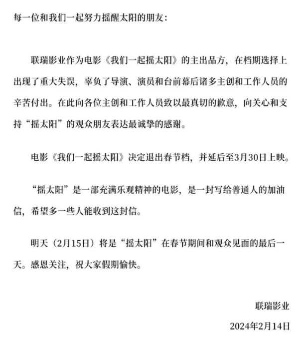 《我們一起搖太陽》於情人節當天率先宣布退出春節檔著實是一個諷刺。 據悉,《我們一起搖太陽》是由韓延指導,彭昱暢跟李庚希主演,於大年初一上映,但排片自上映首日起就不容樂觀,數據顯示,2月10日至2月13日,該片排片占比從7.3%下降至5.4%再到3.2%、3.0%,排片直接斷崖式下跌,單日票房也從3151.53萬元下滑至1465.26萬元、900.91萬元、611.25萬元。作為2024年春節檔唯一的一部愛情電影,《我們一起搖太陽》在情人節也沒能實現“逆襲”。 這部悲催的愛情電影在情人節這天撤檔,著實是一個諷刺。緊接著《紅毯先生》《黃貔:天降財神貓》《八戒之天蓬下界》也宣布退出春節檔,也就是說今年的春節檔已經有四部電影選擇退出了,果然在票房面前,面子不值一提。