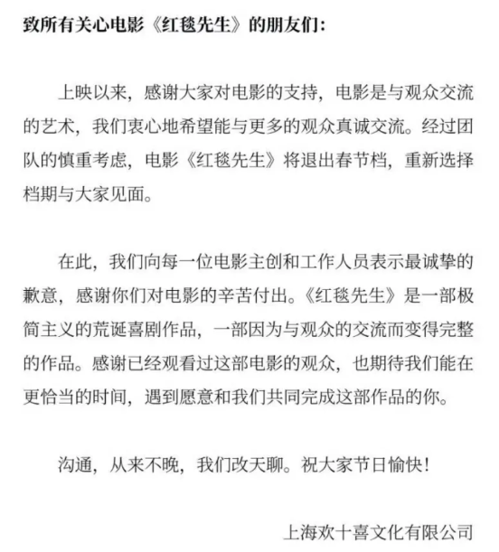 打不贏就撤!劉德華主演《紅毯先生》等四部春節檔電影宣布退出香港新聞網2月17日電 誰都沒有想到,今年春節檔電影厮殺的結局會這麼難看。今天《八戒之天蓬下界》也隨著《我們一起搖太陽》、《紅毯先生》、《黃貔:天降財神貓》之後宣布退出春節檔。至今,今年的春節檔已經有四部電影選擇退出,就連影帝劉德華主演的《紅毯先生》也未能幸免。