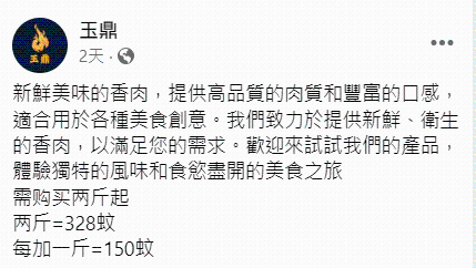 “玉鼎”的Facebook專頁圖片。 翻查資料,根據《貓狗規例》(第167A章),任何人不得屠宰任何狗隻或貓隻以作食物之用,不論其是否供人食用;亦不得售賣或使用或允許他人售賣或使用狗肉及貓肉作食物。違者一經定罪,最高可被判處罰款5000元及監禁6個月。 漁護署隨後在19日發稿,指留意到有網店刊登懷疑出售狗肉的廣告帖文,已即時展開調查,並會聯絡警方一同跟進。署方指出,會蒐集有關證據,如證屬實,會向相關人士提出檢控,並強調絕不容忍有關違法行爲,必定會嚴格執法,嚴肅跟進所有違規行為。同時呼籲市民切勿購買貓狗肉。 然而,有關專頁不但未有刪除帖文,反而在文章下猖狂留言稱“多謝大家幫我分享給更多人知道,黑粉也是粉”,更聲稱“上了新聞後,我會有更多流量、更加多客人”。