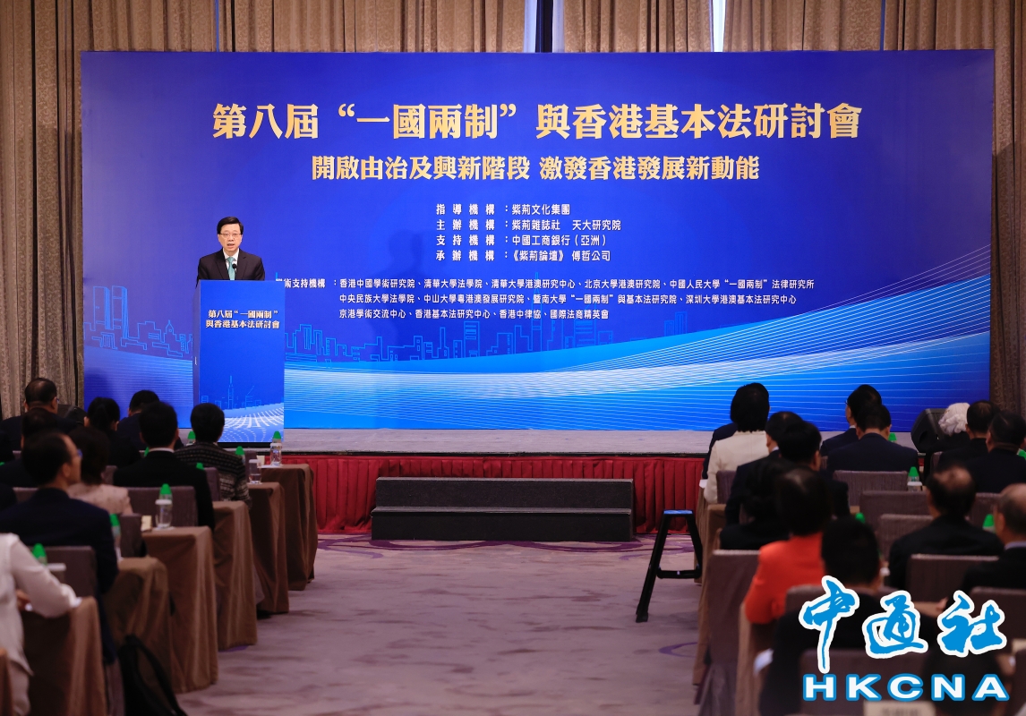 (香港中通社記者 曹文毓攝) 第三是要主動出擊,推廣“一國兩制”成就。李家超指出,要善用話語權,主動擴展香港的朋友圈。要把香港自由、開放和中外融合的實際情況、“一國兩制”成功實踐等真實的香港故事向世界說好。他計劃未來會繼續訪問內地和外地,包括東盟和歐洲國家,聯同香港各界領袖一起推廣香港的新優勢,為香港招商引才,鞏固傳統市場,並開拓新興市場。 最後一點是要居安思危,完善維護國家安全制度。他重申,當今的國際環境風雲變幻,複雜無常。在世界百年未有之大變局下,全球商界、投資者都尋求穩定而可預期的投資環境。《香港國安法》的實施效果立竿見影,使香港社會重回安定。特區政府視健全香港特區維護國家安全的法律制度和執行機制為重要責任。為此,特區政府將在明年完成《基本法》第23條本地立法,並把方案與《香港國安法》聯繫起來,完善特區維護國家安全的法律體系和系統。完成23條立法,一方面是履行香港特區維護國家主權、安全和發展利益的一份憲制責任,同時也是為了更好保障香港社會的繁榮穩定,使全球的企業和人才,都對香港更有信心,可以更放心來香港投資、營商、工作、生活,以至學習、深造。 李家超強調,只有確保“一國兩制”行穩致遠,香港才可以在安定的環境下實現新飛躍。特區政府已完善地區治理,重塑區議會,確保區議會重回《基本法》第97條所定下的原意,成為特區政府實施有效管治、保持社會穩定的諮詢組織。他深信,只要團結一心,香港必能堅守“一國”之本、發揮“兩制”之利,再創輝煌。 今年“一國兩制”與香港基本法研討會的主題是“開啓由治及興新階段,激發香港發展新動能”,各地專家學者齊聚共同商議香港在“一國兩制”和《基本法》下的發展機遇。 (完) 【編輯:孟宜君】