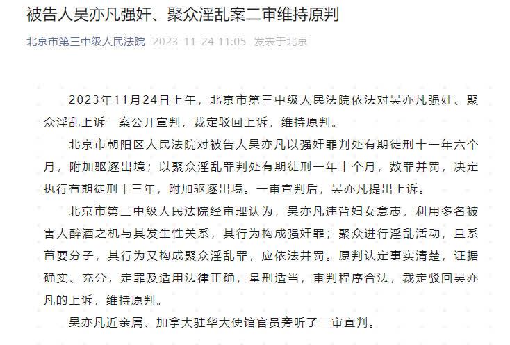 香港新聞網11月24日電 2023年11月24日上午,北京市第三中級人民法院依法對吳亦凡強姦、聚眾淫亂上訴一案公開宣判,裁定駁回上訴,維持原判。 北京市朝陽區人民法院對被告人吳亦凡以強姦罪判處有期徒刑十一年六個月,附加驅逐出境;以聚眾淫亂罪判處有期徒刑一年十個月,數罪併罰,決定執行有期徒刑十三年,附加驅逐出境。一審宣判後,吳亦凡提出上訴。 北京市第三中級人民法院經審理認為,吳亦凡違背婦女意志,利用多名被害人醉酒之機與其發生性關係,其行為構成強姦罪;聚眾進行淫亂活動,且系首要分子,其行為又構成聚眾淫亂罪,應依法併罰。原判認定事實清楚,證據確實、充分,定罪及適用法律正確,量刑適當,審判程序合法,裁定駁回吳亦凡的上訴,維持原判。 吳亦凡近親屬、加拿大駐華大使館官員旁聽了二審宣判。