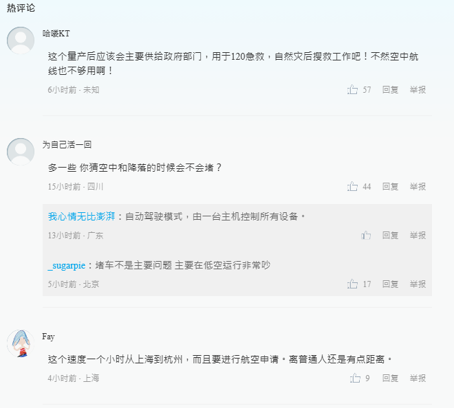 空中出租車引發熱議。 還有網友進行大膽猜測:“多一些,你猜空中和降落的時候會不會堵?” 據瞭解,峰飛盛世龍“空中出租車”可搭載5人,巡航速度200公里每小時,純電最大航程250公里。它既可以像直升機一樣垂直起飛和降落,也可以如固定翼大飛機一樣高速巡航,航空器可按照既定航線自動飛行,如遇突發情況,飛控系統會產生安全響應。 (完) 【編輯:錢林霞】