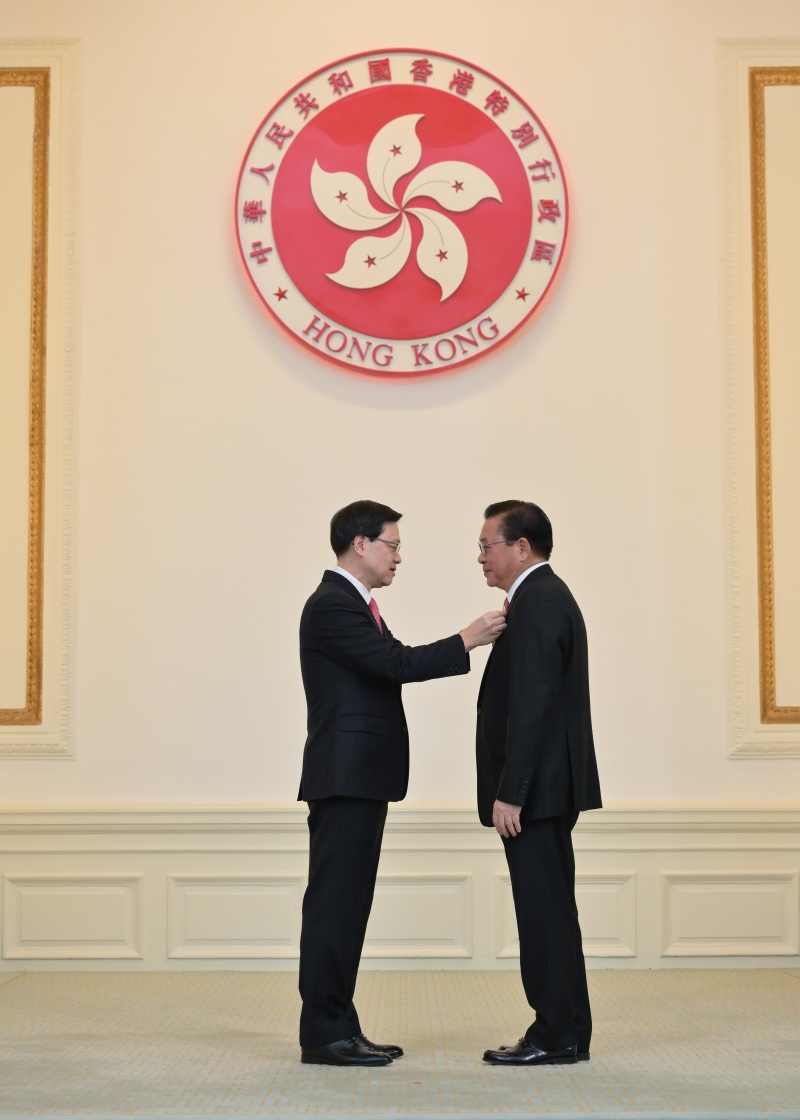 李家超頒授大紫荊勳章予林健鋒。圖自香港特區政府新聞處 2023年授勳名單已於今年7月1日公佈,共有403人獲頒授勳銜及嘉獎。其中,有5人獲頒大紫荊勳章,10人獲金紫荊星章,28人獲銀紫荊星章,41人獲銅紫荊星章。 獲授勳銜及嘉獎的人士來自社會不同階層和不同背景,他們為香港在不同範疇作出重大的貢獻,惠及社會各個領域和界別。 其中,鑽石山荷里活廣場兇殺案中,拿著椅子試圖阻止疑兇繼續施襲的酒樓廚師何兆輝,獲頒銅英勇勳章。行政長官亦感謝4位市民義不容辭在現場即時伸出援手,協助搶救受害人,因此向他們頒授行政長官社區服務獎狀。(完) 【編輯:許豐悅】