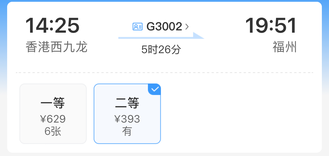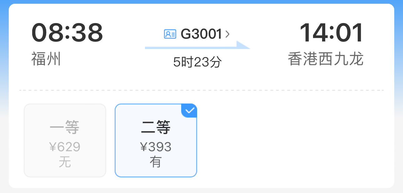 鐵路去程車次參考。圖自中國鐵路12306購票APP 【返程線路】:在當地吃個特色早飯後,早晨08:38從福州站出發,當天下午14:01就回到香港西九龍了。