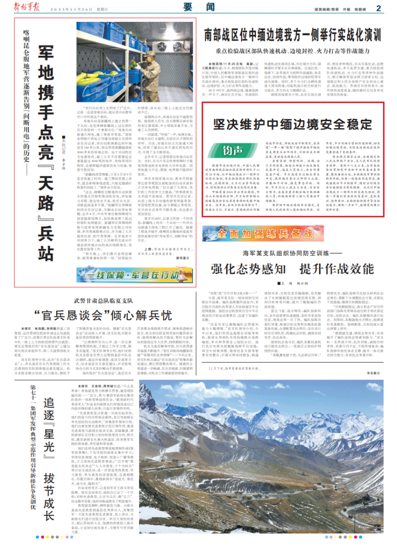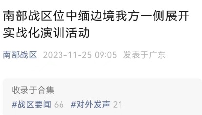 【相關新聞】 解放軍報:堅決維護中緬邊境安全穩定 據解放軍報11月26日報道,根據年度訓練計劃,中國人民解放軍南部戰區組織戰區陸軍部隊於11月25日起,位中緬邊境中方一側舉行實戰化演訓,旨在檢驗戰區部隊快速機動、邊境封控、火力打擊等作戰能力,時刻做好應對各類突發情況準備。 中緬有著2000多公里邊境線,作為山水相連的近鄰,中方始終堅持從戰略高度和長遠角度看待和發展中緬關係。近年來,在雙方的共同努力下,兩國全方位、多層次、寬領域的合作格局逐步形成,傳統友誼不斷深化,在共建“一帶一路”框架下穩步推進中緬經濟走廊重點合作項目,不斷結出豐碩成果,更好惠及兩國人民。 親望親好、鄰望鄰好。近期,由於多種原因,緬甸北部數個地區爆發武裝衝突,造成人員傷亡,安全形勢複雜嚴峻。中方高度關注緬北有關衝突,敦促相關各方立即停火止戰,開展和平對話,避免事態昇級。同時,中方還從人道主義出發,付出巨大努力,妥善安置并配合緬方救助避戰人員,積極協助第三國人員借道中國撤離。 維護好中緬邊境的安全穩定,是兩國人民的共同心願和福祉所在。近年來,中方同緬方密切溝通協調,切實加強邊境管控,為促進邊境地區經濟發展創造了良好條件。 堅決捍衛國家主權、邊境穩定和人民生命財產安全,是人民軍隊的職責使命。黨的十八大以來,全軍各級堅決貫徹黨中央和中央軍委決策部署,聚焦備戰打仗,全面推進軍事訓練轉型昇級,任務一線練兵形成常態,備戰懾戰水平不斷提升,隨時應對現實安全威脅能力有效增強。此次位中緬邊境我方一側舉行的實戰化演訓,將進一步強化官兵的憂患意識、危機意識、使命意識,全面檢驗和提升管邊控邊能力,確保一聲令下,能够有效履行使命任務。