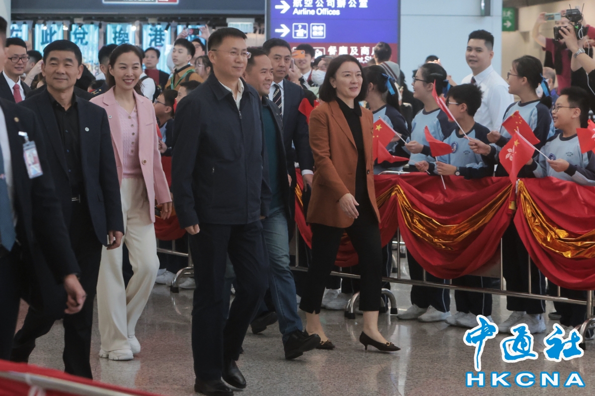 小學生們在接機大堂揮動國旗及區旗歡迎代表團來訪。(香港中通社記者 謝光磊 攝) 當天下午的媒體見面會,4名航天員換上一身深藍色航天員秋冬常服,與其他成員一同亮相。身兼團長的林西強表示,代表團今次是應香港和澳門特別行政區政府的邀請,來向港澳同胞報告國家載人航天工程的最新進展,分享中國太空站圓滿完成建造的喜悅,冀推動港澳地區更多人參與載人航天事業。 他指出,國家自1992年起以三步走發展策略,由神舟5號首次實現中華民族飛天夢想之後,天宮1號、天宮2號等飛行任務突破了關鍵技術,以及其後12次載人、載物的飛行任務,圓滿實現了三步走發展策略目標。他又說,今年載人登月任務已得到中央政府正式批准立項,目標是在2030年前實現中國人首次登月,開展月球科學考察及相關技術試驗,突破掌握載人地月往返、月面短期駐留及人機聯合探測等關鍵技術,現時載人航天辦公室已全面部署準備工作,包括研製新一代載人運載火箭、新一代載人飛船及月面着陸器等。