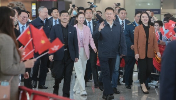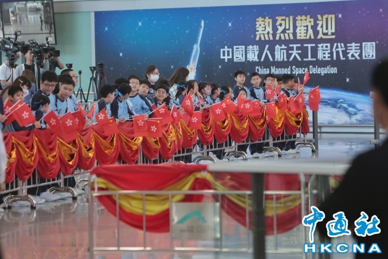 中國載人航天工程代表團向迎接者致意。(香港中通社記者 謝光磊 攝) 一行人昨天中午抵達香港國際機場,香港特區政府政務司司長陳國基、特區政府民政及青年事務局局長麥美娟,中央人民政府駐香港特別行政區聯絡辦公室副主任盧新寧、中國外交部駐香港特別行政區特派員公署署理特派員李永勝等到機場迎接。另外,逾百名小學生們身穿統一的淺藍色上衣,手持鮮紅的國旗與區旗,歡迎代表團的到來。