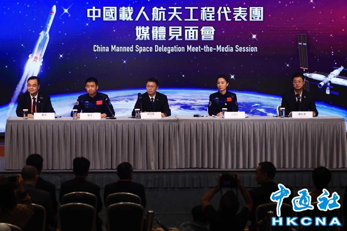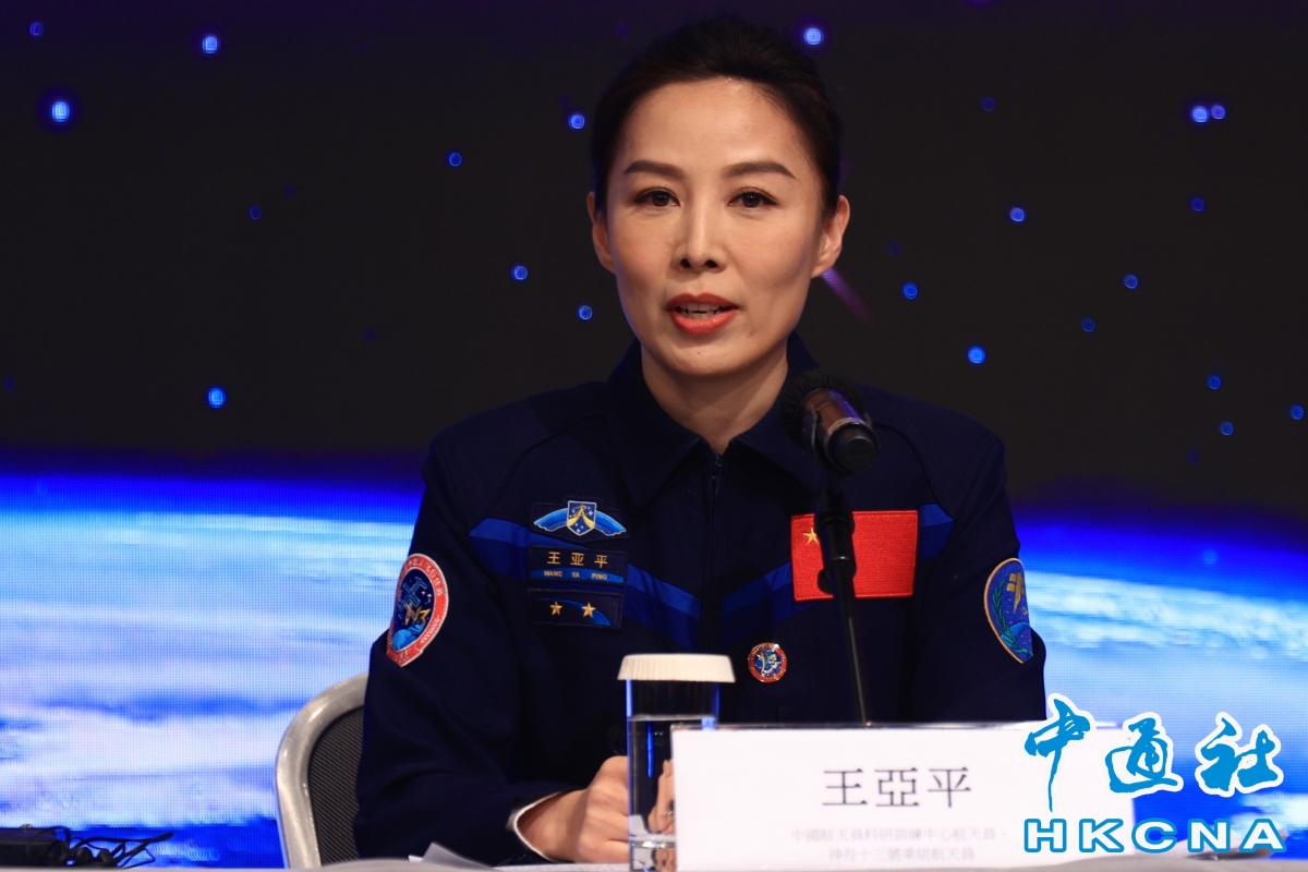 王亞平出席見面會。(香港中通社記者 許其皓攝) 當晚,代表團出席由特區政府舉行的歡迎晚宴。李家超致辭時形容“有朋自太空來”,大家的心情何止“樂”,更是激動、興奮和無比自豪。他感謝中央人民政府對香港的關愛,安排包括航天員、航天工程系統相關領域專家等共17位代表訪問香港。他又說,知道很多香港市民都已經急不及待,希望在交流活動一睹各位航天代表的風采。他亦感謝中國載人航天工程辦公室,特別為香港科學館和香港歷史博物館舉辦的“中國載人航天工程展”展覽,提供了接近30件珍貴的航天展品,相信香港市民及遊客都很期待觀賞到國家瑰寶的機會。