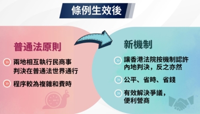 《民商事法》明年生效 堵塞內地與港追數漏洞香港新聞網11月30日電 為防止不法商人利用內地及香港司法制度差異,逃避欠款等相關的法律責任,香港和內地簽訂的《內地與香港判決互認安排》在明年1月29日起同步實施。香港特區政府律政司副司長張國鈞表示,《安排》可免卻兩地重複訴訟,利用“一國兩制”的獨特優勢,以簡單、易明、清晰、有效的方式,協助當事人追討金錢或權益,省卻漫長又複雜的審訊過程。 張國鈞接受星島日報專訪時表示,律政司一直積極推動建立和優化兩地的民商事司法互助制度,現時如內地的民商事案件判決希望在香港執行時,當事人須透過律師入稟高等法院,告知法庭他在內地已獲勝訴的判決,但原告人及被告人仍須按普通法制度下的民事訴訟程序,提交陳述書及證據,排期並進行審訊,爭拗與內地官司一樣的議題,待法官作出判決才能執行,程序既複雜又費時,令當事人在香港追討權益的等待時間數以年計。是次《安排》則可讓內地判決的勝方,向香港高等法院登記其判決,當香港法院信納該判決符合《內地民商事判決(相互強制執行)條例》的要求時,便會發出登記令,承認和強制執行該內地判決。