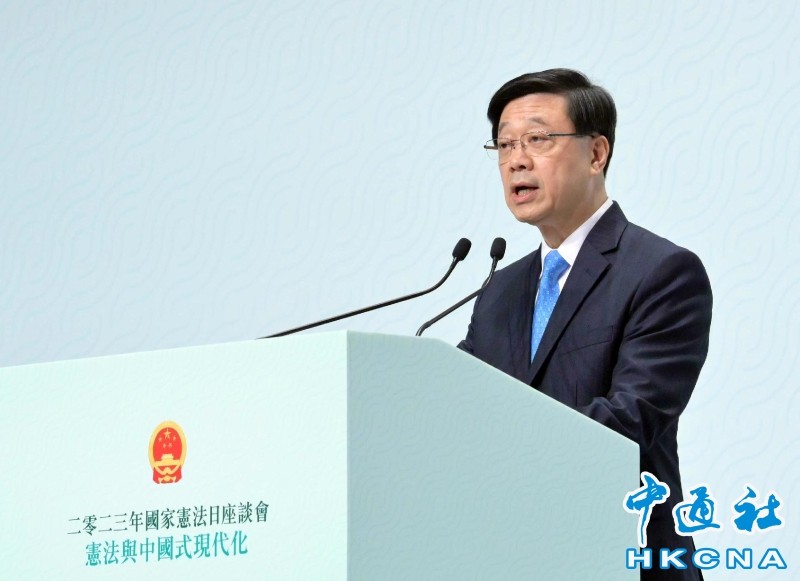 香港中通社12月4日電(記者 徐嘉儀)12月4日是國家憲法日,香港特區行政長官李家超在國家憲法日座談會上解讀憲法和香港特區的關係。他說,中國式現代化的道路要以憲法作保障,同樣地,香港特區走“一國兩制”這條在歷史上嶄新的道路,也一定要以憲法和基本法作為保障。 當天,香港特區政府聯同中央人民政府駐香港特別行政區聯絡辦公室合辦以“憲法與中國式現代化”為主題的國家憲法日座談會,並由勵進教育中心擔任支持機構。 李家超致辭時表示,香港在“一國兩制”下,擁有“背靠祖國、聯通世界”的獨特優勢,是國際金融、航運、貿易中心,法治傳統源遠流長,營商環境自由開放,是世界上最具競爭力的經濟體之一。這些國際化優勢的基礎和保障,就是憲法和基本法共同構成香港特區的憲制秩序。