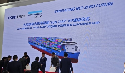 香港新聞網12月7日電 中國船舶集團有限公司旗下江南造船(集團)有限責任公司日前在2023年中國國際海事技術學術會和展覽會上,正式發布全球首型、世界最大24000TEU級核動力集裝箱船船型設計。這標誌著江南造船在“近零排放”船型研發領域取得了革命性成果,並進一步拓展了該公司集裝箱船系列品牌。