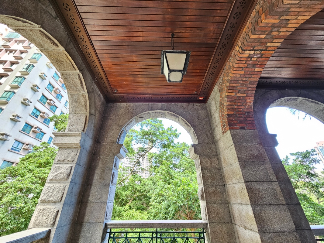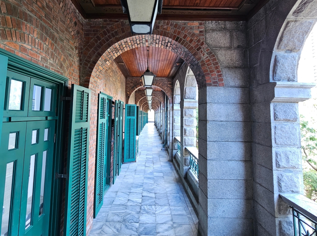 這裡最初是為醫院人員住所而設計及建造,攝於約1898年。 這座始建於1892年的建築,採用了早期巴洛克式的建築風格來建造,例如兩行排列整齊的拱門,內有寬闊的遊廊和下方配以粗琢的花崗石塊,外牆磨光的琢石線腳、隅石、檐口、腰線等都設計得精巧雅致。在不少殖民時期的建築物中,遊廊有一個重要作用,即適應香港的亞熱帶氣候,避免陽光直接照射室內,而遊廊裡的每一扇百葉門窗,其縫隙都有通風作用。