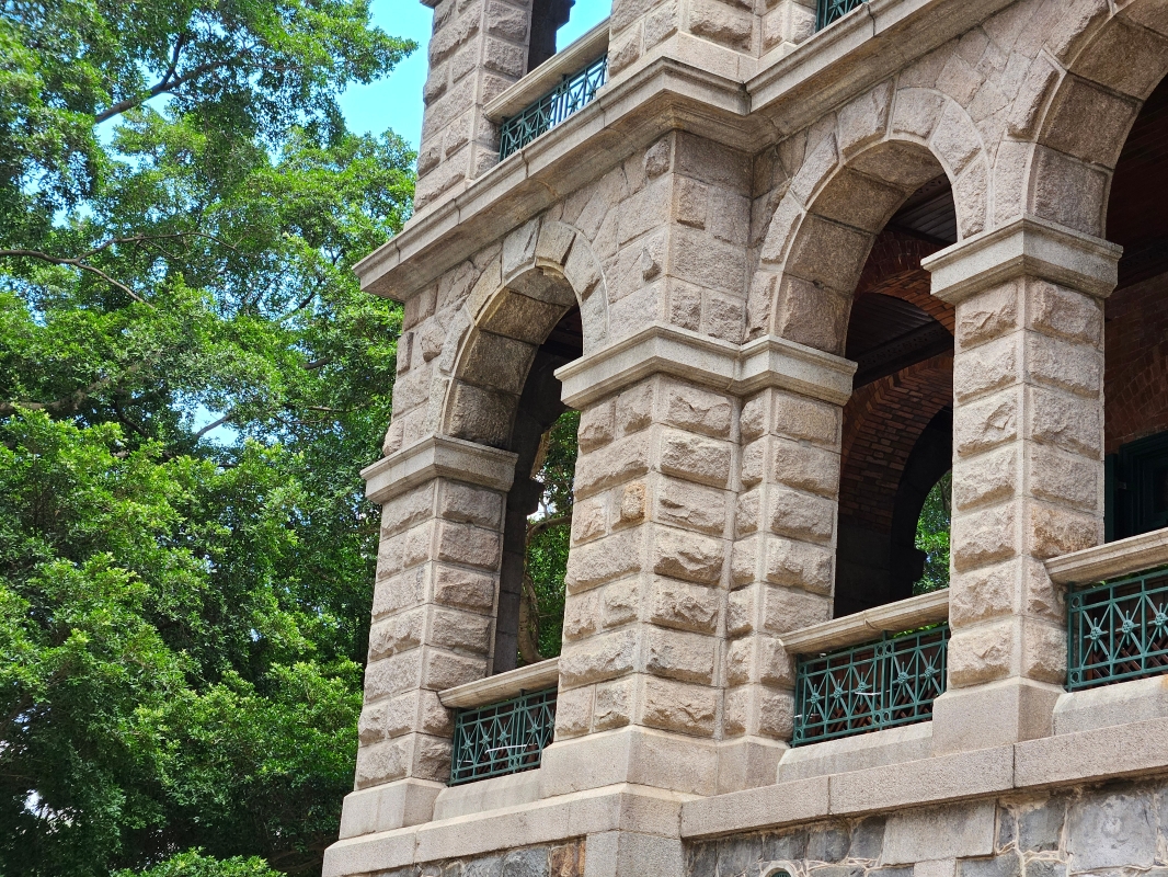 牛眼窗是為地庫通風之用。(香港中通社記者 黃璇攝) 此外,山牆、小尖塔和裝飾用的女兒牆等建造,都一絲不苟,兼且造工精準。屋頂還採用了中式的瓦頂斜尖設計,亦反映因應香港的氣候作出改動。可見它在建造上是十分講究的,同時也耗費了不少心思。 這裡最初是為醫院人員住所而設計及建造,供副院長、政府化驗師、藥劑師和歐籍護士住宿。大樓選址該處,皆因它別處一隅,遠離繁囂的皇后大道,環境清幽,有利醫務人員的健康。