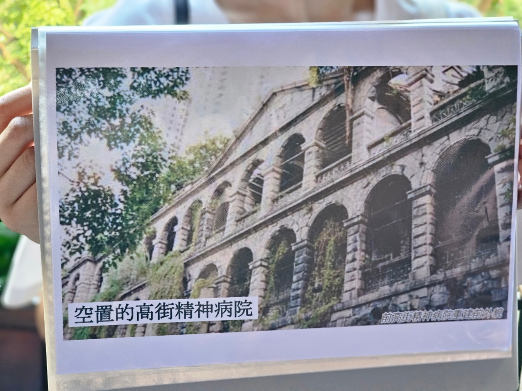 (香港中通社記者 黃璇攝) 讀者或許會好奇,為何這裡會成為精神病院? 原來,香港在1874年之前,是沒有一個專責部門處理精神病人的。直至1906年,香港立法局通過了《癲人院條例》,對精神病者的羈留及照料的形式作出了規範,這時華人患者才得到了較為人道的對待。華人精神病院和外籍人士精神病院於同年合併為域多利精神病院。 1939年戰爭爆發,大量內地移民逃難到港,令香港人口急增。同時令精神病醫療服務的需求急增,以致床位不敷應用。由於以往的精神病院並非提供治療之處,而是供患者短暫停留的地方,情況好轉的華人患者會送至廣州惠愛醫院(中國歷史上的第一家精神病醫院)。但戰亂導致無法將患者送往廣州,因此加劇了床位不足的問題。有見及此,政府便將醫院外籍護士宿舍,改建為精神病院女病房,紓緩擠迫情況。 隨著屯門青山醫院1961年落成,精神科重心轉移,高街舊精神病院改作日間門診部;而擴建部分在1969年1月改作聯合書院高街校舍,直至兩者在1971年遷出。 這棟建築自1971年起,三十年來一度被閒置,相傳其間成為夜間探險熱點及“道友”(吸毒者)聚集地。前文提及這裡常被街坊稱為“高街鬼屋”,而據街坊憶述,1971年前這裡的都市傳說並不多。用較為科學和較多人相信的說法,估計跟癮君子吸毒有關。“道友”們為了不被打擾地在這空置大樓吸毒,因此故意傳出此處有鬼的消息,令其他人不敢接近。 後來一場火災燒毁了大部分由木材建成的主樓,政府便拆卸大部分建築,只保留花崗石立面及L形遊廊,較長的一邊面向高街,較短的一邊面向東邊街。直至2001年,改建為西營盤社區綜合大樓。