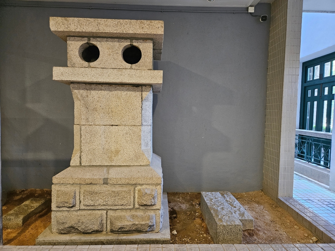 建築物的煙囪,今放在西營盤社區綜合大樓內。(香港中通社記者 黃璇攝)