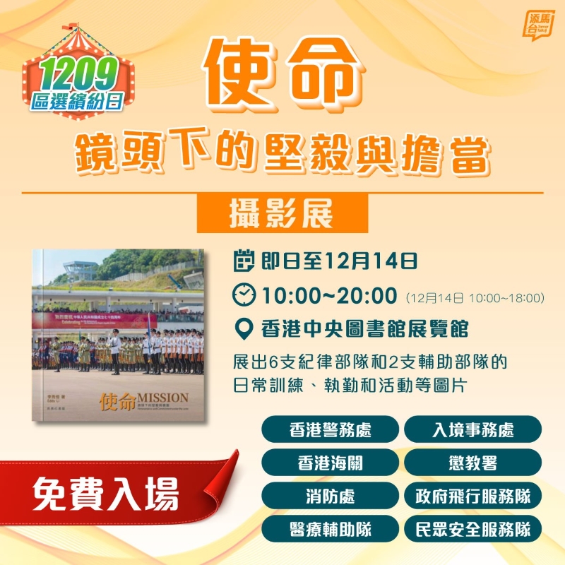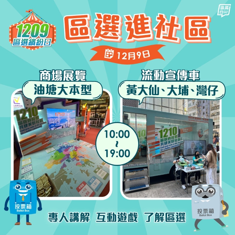 而“區選進社區”將在油塘大本型設商場展覽、東涌巿政大樓設流動遊戲攤位,並會安排三輛宣傳車分別停駐黃大仙、大埔及灣仔區作流動資源中心。另外,亦會免費開放香港科學館和香港太空館、香港藝術館的收費展覽,以及香港濕地公園;並提供多項參觀歷史建築及古蹟的優惠。 除此之外,香港中央圖書館會有“《使命》攝影展”──攝影展是以保安局六支紀律部隊和兩支輔助部隊為主題,亦會安排講座及六節的導賞團,供學生參與。環境及生態局將聯同九巴,在荔枝角月輪街車廠展覽古董巴士及電動巴士,市民可免費參觀。教育局與團體會舉辦“親子繽紛遊樂日”大募集活動,鼓勵全港中小學及幼稚園家長和學生透過親子活動去認識自己居住的地區。而市民到環境保護署轄下“綠在區區”社區回收網絡進行回收,回收最少0.5公斤回收物可獲額外1210“綠綠賞”積分。