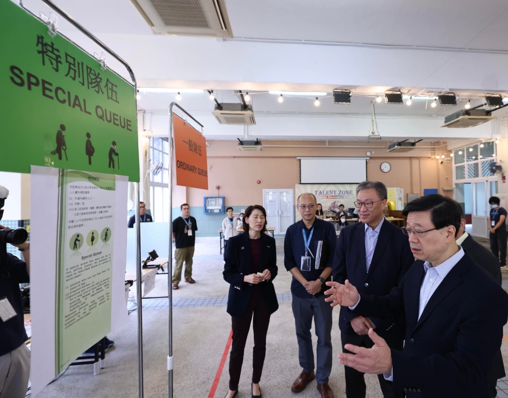 李家超FB。 李家超在社交平台發文指,明天就是完善地區治理後第一場區議會選舉了。為了解區選的安排和準備情況,上午與政制及內地事務局局長曾國衞和選舉管理委員會主席陸啟康到杏花邨一個地方選區票站巡視。票站人員都在積極佈置場地和綵排,為明天的選舉作最後準備。 他指出,巡視期間,票站人員向他介紹投票流程和人力配置,有職員更特別提醒,地方選區的選民投票時只能在選票上蓋一個剔號,否則選票作廢。他強調,票站人員準備充足,對明天票站運作暢順充滿信心。