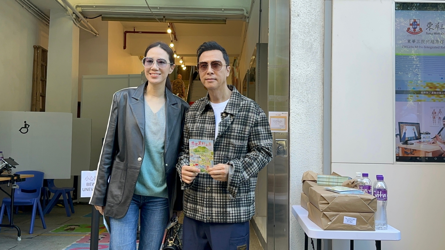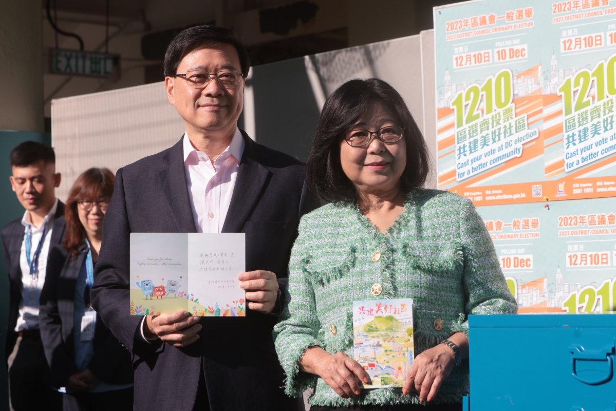 李家超及夫人投票後手持心意卡。(香港中通社記者 謝光磊 攝)