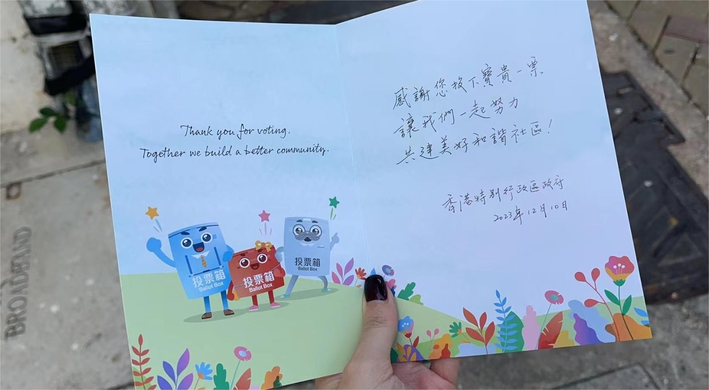 香港新聞網12月10日電 這張區選心意卡“火”了!香港區議會選舉10日投票,選民前往投票站完成投票後,可獲得一張區選心意卡。香港特首李家超等知名人士投票獲領后,紛紛拍照“打卡”留念,亦有大量選民手持心意卡拍照合影,在社交平台上分享。