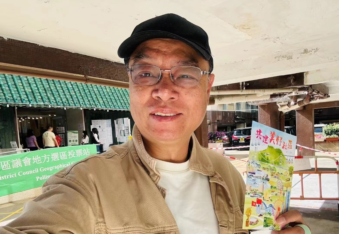 香港導演李力持投票後在票站拍照留念。 實際上,這張心意謝卡旨在感謝市民支持,一起努力共建美好社區。心意卡由公務員自行設計,政府物流服務署以環保紙張製作。設計以全港各區著名景點和地標特色設置在獅子山下,寓意各區共同努力建設美好社區、美好香港。 許多選民獲領心意卡後,手持卡片在票站附近拍照留念。在二手買賣平台,甚至有網民以500港元放售心意卡,更表示心意卡狀態良好、有興趣人士需要到港鐵站交收,共建美好社區。(完) 【編輯:譚暢】