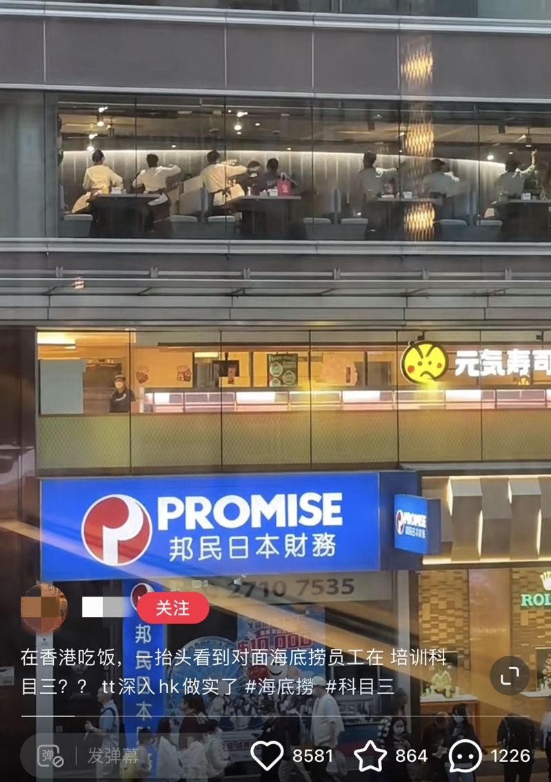 (圖源:視頻截圖) 此前,海底撈員工跳“科目三”的風潮已吹向台灣。據網友爆料,台灣台中大遠百、中友百貨的門店,都有店員大方跳起這種舞蹈,甚至撈面師傅也加入舞蹈行列。 如今,一向“高冷”的香港亦不甘落後,開始舞起“科目三”...... 翻查社交平台小紅書,11月底,有網友上傳影片,稱在香港吃飯,“一抬頭看到對面海底撈員工在培訓科目三?”從其視頻可見,多名身穿海底撈員工服的人舉起雙手、擺動身體,疑似在練舞。 據該網友爆料,有關分店為海底撈油麻地分店。
