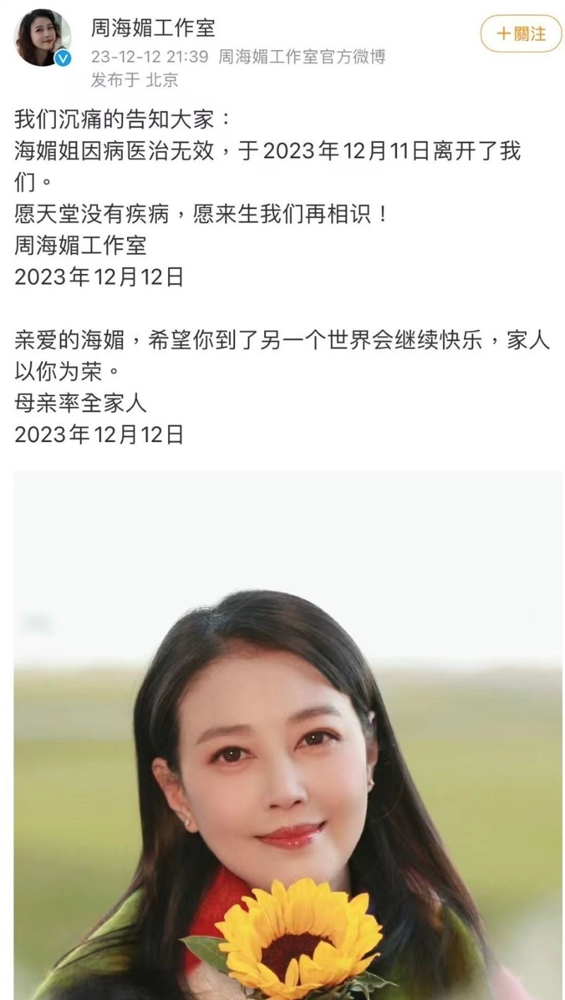 周海媚工作室微博截圖 周海媚1966年在香港出生,就如很多女星的演藝路,她也是參選香港小姐走進TVB拍戲。她參與或主演不少上個世紀80、90年代的大制作,包括《義不容情》《逃學威龍3》,影響力也擴大至台灣。 1994年台灣電視出品《倚天屠龍記》,周海媚出演了“最美周芷若”,令作者金庸都想為她改寫結局。不少台媒近日回顧周海媚上次在台灣出席2018年金鐘獎的影像,足以印證她在台灣的影響力。 90年代初,周海媚連續三年被評為“香港地區最受歡迎女演員”。後來,她的重心移至內地。2018年於再次翻拍的《倚天屠龍記》中出演滅絕師太,再獲好評。這也是香港演員的另一個特質,當年花旦即便演配角,也極敬業。 除了演藝事業出彩,生活中周海媚熱心公益。她曾親往甘肅參加救助貧困母親公益活動,到湖北小鎮探訪留守兒童,自掏腰包為四川攀枝花小學添置電腦。 香港電影工作者總會會長田啟文對中通社記者表示,好的演員不僅有演技,作為公眾人物,做人做事都要值得觀眾留戀。任何一個演藝界的人,曾在行業敬業付出,為行業帶來值得留戀的作品,都值得被懷念。這不僅存在於香港影視界,亦不僅存在於影視界,重要的是這個人為行業付出了什麼。只要是正能量,都值得尊敬。 一個時代過去的重要標誌,是越來越多曾經熟悉的人逐個離開,這個名單會變得越來越長。 從張國榮、梅艶芳……到最近幾年的吳孟達、曾江、吳耀漢、李玟。我們不知送別多少個熟悉的面孔、多少那個年代風華絕代、享譽海內外的演員。大家不僅在回憶每位明星最輝煌的當年,那時香港娛樂行業的自我革新和發展變化,才是根本。 八九十年代,香港有東方好萊塢之稱,亦是華語樂壇風向標,建立起自己的審美範式。那個時代不應只是回憶和懷念,更代表一種難得的精神。對舊事、舊人的重溫,應能煥發從業者的初心夢想,激發今人的創作熱情,這波懷念才不會流於空談。 經常有人在網上討論,這些老演員去世後大家看什麼? 田啟文認為,有這個想法是很好的反思,證明社會氛圍和年輕一代還是尊重付出的人、還是尊重對社會有貢獻的人。業界的健康和可持續發展,各方面都需要改進和平衡。(完) 【編輯:王瑶】