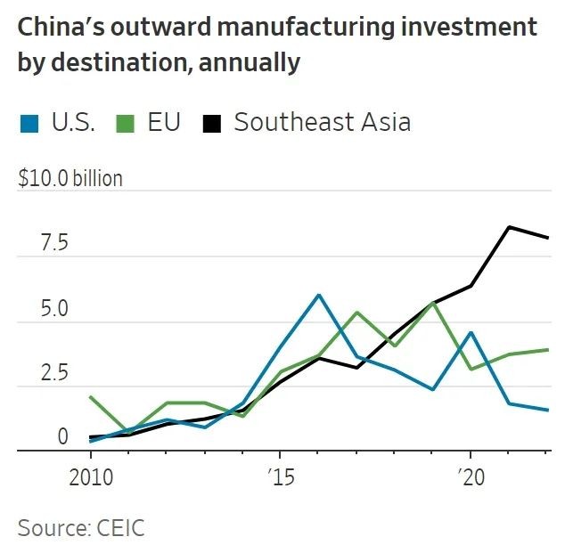 近年來中國製造業對美國、歐盟和東南亞的投資。圖自《華爾街日報》 匯豐銀行首席亞洲經濟學家範力民(Frederic Neumann)表示,他的研究顯示,2014年後為其他國家提供原料的中國出口在大幅上昇,中國在調整自己在全球供應鏈中的角色,而不是放棄這一角色。 “多年來,中國基本上一直是一個終端的組裝商,而現在他正迅速成為全球重要的零部件供應商。”他強調道,“我們必須認識到,中美相互依存是持續存在的。” 德國安聯保險集團(Allianz)去年底一項研究還發現,中國目前是美國276種商品的“關鍵供應商”(critical supplier),覆蓋範圍從消費電子產品到家用設備再到化學品,這些產品占美國國內生產總值(GDP)的比例從2018年的0.7%和2010年的0.4%上昇到了1.3%。反之,美國僅是中國22種商品的關鍵供應國,商品價值占中國GDP的0.3%。 《華爾街日報》指出,這些現實凸顯了政策制定者和企業在尋求將美國從中國龐大的製造業中分離出來所面臨的尷尬局面,美國對華供應鏈不光沒能如其所想的“脫鈎”,還由於生產過程中增加了更多步驟導致成本上昇,第三國的價格上漲最終又轉嫁給了購買這些商品的美國企業或消費者。 哈佛商學院和達特茅斯塔克商學院在今年8月發表的一篇論文中發現,在2017年至2022年間,美國從中國進口的份額每下降5個百分點,從越南進口的價格就會上漲近10%,從墨西哥進口的價格上漲3%。 報道提到一名2016年在柬埔寨首都金邊開設海外工廠的中國鞋品製造商,他的柬埔寨工廠有700多名工人,為許多美國鞋類品牌提供服務。 他說,由於當地勞動力缺乏動力等原因,在柬埔寨盈利比在中國更難,但他仍然願意留下,因為美國客戶告訴他,他們願意接受因遷廠至柬埔寨而增加的8%至10%的成本,“美國客戶不太關心成本,而更關心地緣政治風險。” 8月11日,中國商務部發佈的《美國履行世貿組織規則義務情況報告》(以下簡稱《報告》)指出,美國在霸權和冷戰思維作祟下,采取多種保護主義做法,如濫用國家安全、提高關稅或采取限制措施、巨額補貼扶持國內產業、挑動“脫鈎”“斷鏈”、推動“近岸/友岸外包”等,片面追求所謂的供應鏈“安全”和“韌性”,嚴重擾亂了全球產業鏈和供應鏈的安全與穩定。 《報告》強調,從美國自身來看,“脫鈎”并未使供應鏈按預期回流美國,反而使美國企業和家庭承受額外的關稅負擔;從全球來看,美國的做法不僅不會增強全球產業鏈和供應鏈的韌性,反而會導致全球產業鏈和供應鏈更加脆弱甚至分裂。 對於美國政府一再鼓吹對華供應鏈“脫鈎”,并施壓外企將產業鏈轉移出中國,我外交部曾多次作出回應表示,美方多次表示無意對華‘脫鈎’,無意阻撓中國經濟的發展,美方應當將這些承諾落到實處。美方濫用出口管制措施,嚴重損害中國企業的正當權益,不利於全球產供鏈的穩定,違反市場經濟和公平競爭原則,不符合任何一方的利益,中方對此堅決反對。(完) 【編輯:許豐悅】