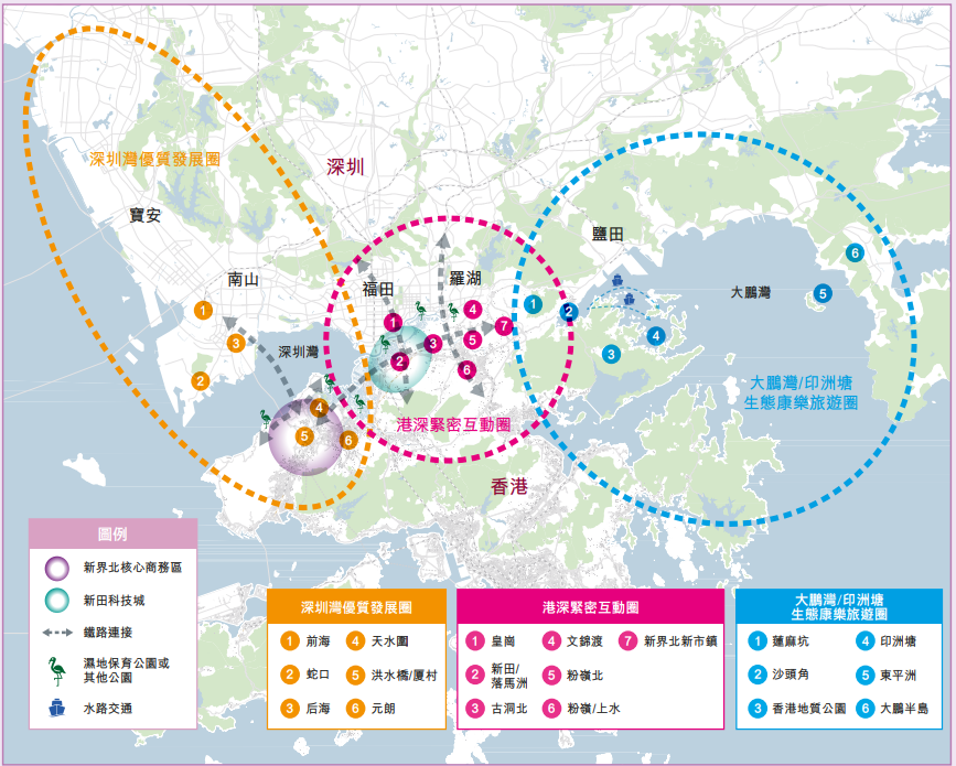圖源:星島新聞網 12月18日,首批10名香港公務員來到深圳展開約三個月的交流,標誌著內地大灣區城市和香港特別行政區的公務員交流協作項目正式落地實施,粵港公務員深度交流合作進入了新階段。他們將會涉及地區治理、科技發展、城市規劃、交通運輸和環境保護等多個領域,在深圳市實地交流學習三個月。香港公務員事務局局長楊何蓓茵在接受采訪時表示,未來粵港兩地公務員有機會將互換“掛職”,希望通過這一項目促進兩地公務員對彼此的認識,并加深香港公務員對內地政府部門架構、工作流程等方面的瞭解。 8、北部都會區 10月30日,香港特區政府公佈《北部都會區行動綱領》,明確北部都會區發展願景、區域規劃、主要建設項目等,并提出了8個目標。
