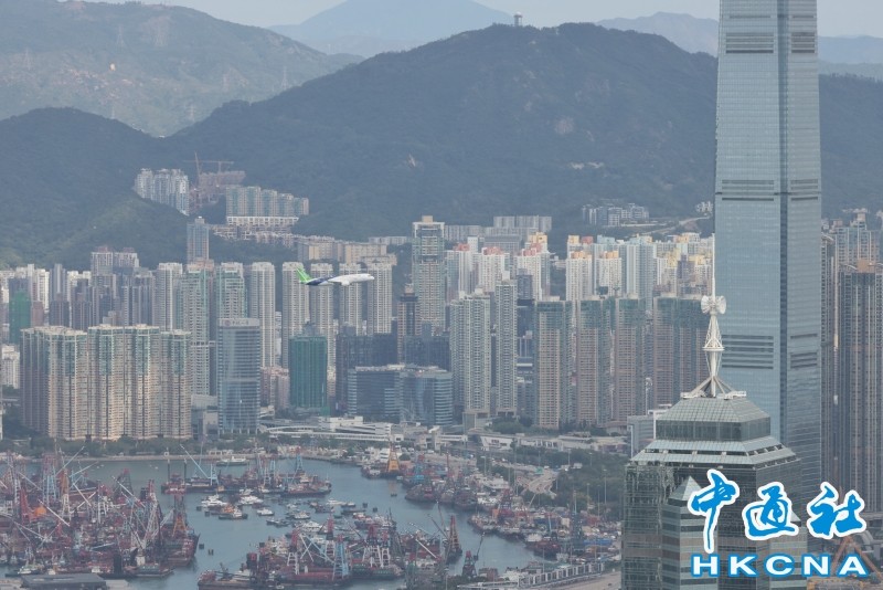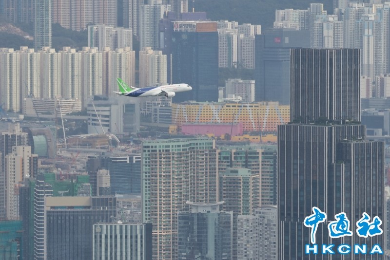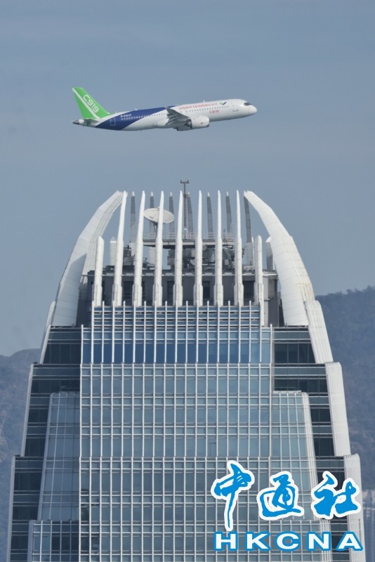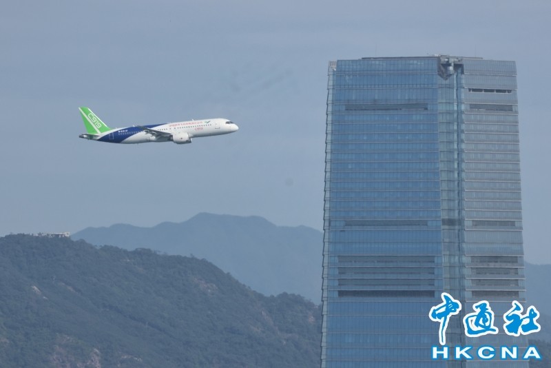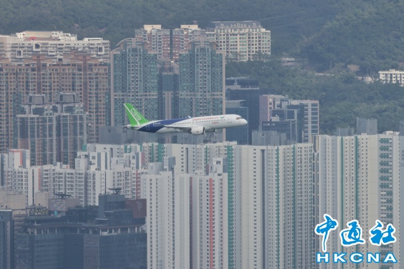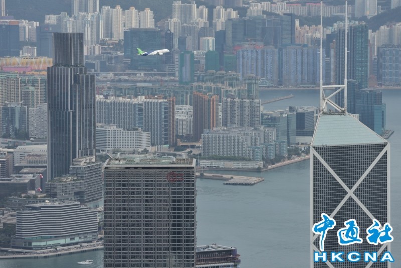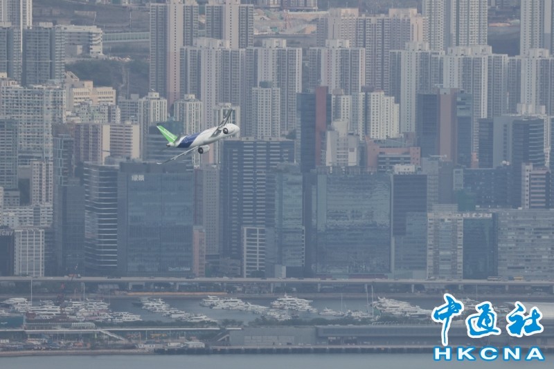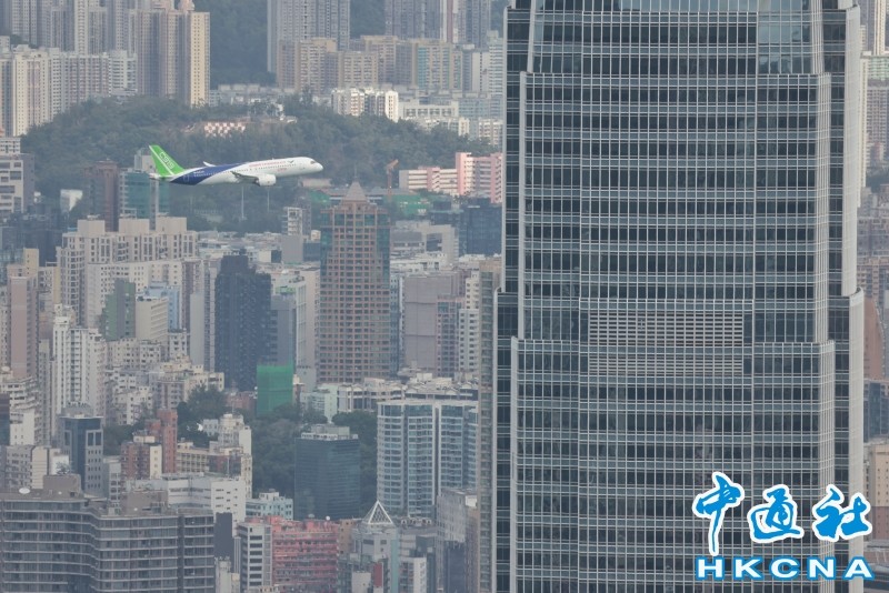 香港新聞網12月16日電 由中國自主研製的C919飛機及ARJ21飛機12日首次到訪香港。今早(16日),C919飛機飛越維港上空進行飛行演示。早上約10時30分,C919飛機在香港國際機場起飛,早上約10時50分,C919由西至東進入及飛越維港上空,並環繞香港島兩圈,吸引大批市民觀賞。行政長官李家超亦發文表示,他捕捉到C919飛機翱翔維港上空的一刻,感覺很興奮。 C919先飛到南丫島對出上空繞了數圈,至約10時50分,C919由西至東飛入維港,綠色機尾、藍白色機身清晰可見;早上約11時6分,C919第二度飛越維港上空。當日天色晴朗、有陽光,C919在維港上空翱翔,融入維港景色。
