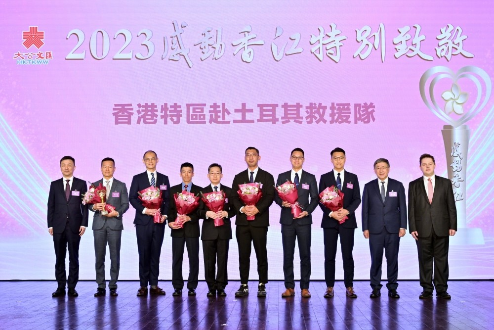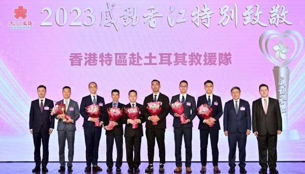 “2023感動香江特別致敬”獎項。大會提供圖片 “不放過任何拯救生命的機會,救災無分國界”今年2月,土耳其和叙利亞接壤地區發生強烈大地震。香港特區政府組成59人的救援隊飛赴災區奮戰逾200小時,在強震後的一周奇跡般地救出4名幸存者,并挖掘出6具遇難者遺體。儘管救援隊隊員在當地面對包括餘震、嚴寒及道路嚴重損毀在內的種種困難,但他們仍然迎難而上,爭分奪秒,不放過任何拯救生命的機會,展現了救災無分國界的互助精神,充分展示了香港特區政府公務員困隊的優秀能力,成為國家和香港的驕傲。
