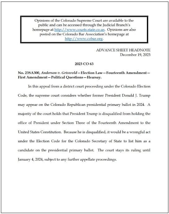 科羅拉多州最高法院裁決文書。網絡截圖 據瞭解,自2006年以來,科羅拉多州歷次州長選舉獲勝方均為民主黨。現任科羅拉多州7名大法官,均由民主黨籍州長任命。此次否決特朗普參選資格的州最高法院法官理查德·加布里埃爾、梅麗莎·哈特、莫妮卡·馬爾克斯和威廉·胡德三世中,有一人是公開同性戀者,一人為民主黨籍。另外三人中,也只有首席大法官布萊恩·博特賴特一人為公開共和黨籍,卡洛斯·薩穆爾和瑪麗亞·貝爾肯科特黨籍信息不明。 雖然這次的裁決適用範圍只限於科羅拉多州,但值得一提的是,類似的訴訟并不僅在科羅拉多州進行。 據報道,已有超過25個州的訴訟挑戰特朗普在2024年總統選舉中的候選人資格。明尼蘇達州和新罕布什爾州的相似訴訟因為程序性問題而被駁回。 上個月,密歇根州的一位地區法官裁定,特朗普2024年總統競選資格裁定問題是一個政治問題,不應由法院來決定。對於這個裁決,當地的原告已經向密歇根州最高法院提起上訴。 特朗普團隊強烈譴責:將向聯邦最高法院上訴 針對科羅拉多州的裁決,特朗普的競選團隊表示了強烈譴責。 “毫不奇怪,由全體民主黨任命的科羅拉多州最高法院已經做出了對特朗普總統不利的裁決,支持了由索羅斯資助的左翼團體的計劃,該計劃代表了狡猾的喬·拜登將干預選舉,通過將特朗普總統的名字從選票上移除,剝奪科羅拉多州選民選擇他們喜歡的候選人的權利。”特朗普競選發言人史蒂芬·張說。 他還表示特朗普競選團隊將就這一裁決向美國聯邦最高法院提出上訴:“我們對美國最高法院有充分信心,它會快速地為我們做出判決,并終結這些不美國的訴訟。”