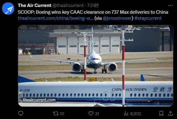 航空業媒體《氣流》雜誌推文截圖 據中國民用航空局網站消息,12月8日,中國民用航空局副局長在京會見波音公司研發項目與客戶支持高級副總裁邁克·弗萊明(Mike Fleming),雙方就波音在華經營發展及加強交流合作等議題深入交換意見。 弗萊明表示,波音重視中國市場并對未來發展保持樂觀,願積極與中方深化合作,眾志成城推動航空業發展,不斷提供更好的產品,造福中美兩國以及全世界人民。 有兩名消息人士向《氣流》雜誌透露,在會談結束後不久,8日晚些時候,波音公司從中國民用航空局獲得一項關鍵批准,將準備向中國交付單通道的737 MAX飛機。 路透社援引航班跟蹤網站FlightRadar24數據稱,當地時間20日下午,一架指定給一家中國航空公司的737 MAX從位於西雅圖的波音機場飛往位於華盛頓州的工廠,隨後返回。 美國投資公司傑富瑞和德意志銀行的分析師認為,這似乎是一次客戶驗收飛行,即由航空公司飛行員在交付前進行的試飛。 路透社認為,對波音來說,恢複交付將象征著重新打開中國這個全球最重要航空市場之一的大門。波音此前預計,到2042年,中國航空公司將需要8560架新的商用飛機,中國市場將占全球飛機需求的20%。 因於2018年和2019年先後在印尼、埃塞俄比亞發生兩次空難并造成346人遇難,737 MAX型客機在美國聯邦航空管理局(FAA)的要求下於2019年3月中止運行。 同年12月16日,波音宣布,計劃從2020年1月開始暫停生產737 MAX。此後,波音一直致力於推動MAX複飛。 路透社2020年1月就曾報道,737 MAX停飛影響了波音2019年的整體表現,其與競爭對手空客在飛機交付量方面的排名發生逆轉。2022年7月,中國三大航空集團(南航、國航、東航)“一口氣”訂購292架空客飛機後一事,對波音公司造成巨大衝擊。 不過,波音并不甘心落於空客之後。波音公司首席執行官當時表態稱,“地緣政治事件”讓波音在中國市場“放慢腳步”,但他認為“我們有一天會回到那裡,雖然這不會很快發生”。 在波音印尼空難事件發生五年後,今年11月,美國聯邦航空管理局終於宣布調整737 MAX系列飛機的認證監管。此前,美國聯邦航空管理局已在2020年11月解除對737 MAX的停飛禁令,其他國家也逐漸跟進。 在11月31日例行記者會上,有外媒記者問道,有報道稱,中方可能同意承諾購買美國波音737 MAX飛機,這意味著兩國關係迎來“破冰”,這也是波音公司盼望已久的交易。你對此有何評論? 我外交部發言人毛寧回答稱:“這個問題建議你向中方主管部門瞭解。”(完) 【編輯:豐悅】