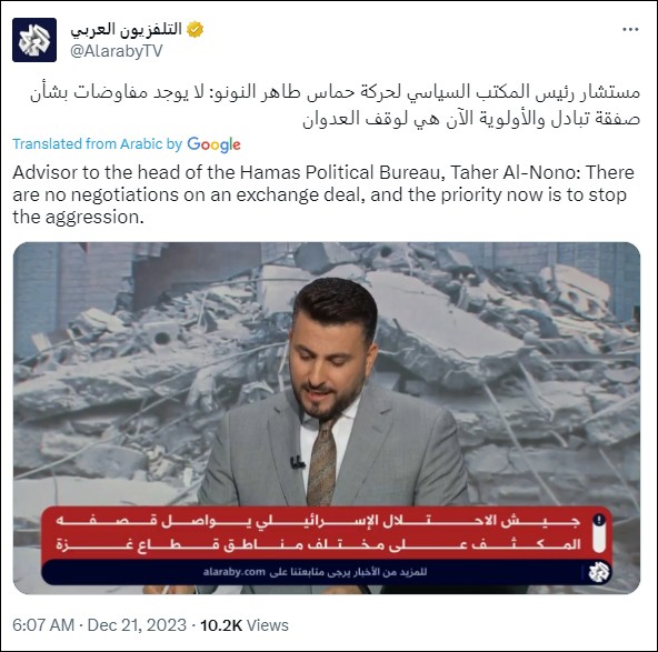 Al Araby電視台推文截圖 哈馬斯是在Telegram發佈的一份阿拉伯語聲明中宣布這一決定的。該聲明寫道:“巴勒斯坦各派決定,除非(以色列)全面停止侵略,否則不應談論囚犯或交換交易。” 英國廣播公司(BBC)稱,目前尚不清楚聲明中具體指的是哪些派別,規模較小的巴勒斯坦伊斯蘭聖戰組織(傑哈德)在加沙也扣押了部分人質。 另據俄羅斯衛星通訊社21日報道,哈馬斯政治局局長的媒體顧問塔希爾∙努努接受Al Araby電視台采訪時也否認了有關哈以正就釋放被扣押人員進行談判的報道。他強調,哈馬斯不會在軍事行動還在繼續的背景下進行換俘談判。 “以色列想要欺騙自己的人民。我們的首要任務是阻止對巴勒斯坦人民的侵略,此後才能談到協議。現在沒有就協議進行談判,對話的重點是停止侵略的必要性,與佔領者(觀察者網注:指以色列)在巴勒斯坦土地上有關的政治問題。” 在國際社會不斷對以色列施壓之際,路透社20日報道稱,在卡塔爾和埃及的斡旋下,哈以雙方正就停火和釋放人質進行“密集”談判。 以色列總統赫爾佐格19日說,以色列願意與哈馬斯達成一項新的臨時停火協議。知情官員透露,該協議要求哈馬斯釋放40名被扣押人員,并同意暫時停火一周。 與此同時,哈馬斯政治局領導人伊斯梅爾·哈尼亞20日訪問埃及開羅討論包括人質交換在內的加沙問題。 《華爾街日報》20日披露,這次有關人質的談判將首次包括加沙地帶活動的第二大巴勒斯坦武裝組織傑哈德。據悉,傑哈德要求以色列釋放所有巴勒斯坦服刑人員,換取所有剩餘的以色列被扣押人員,以媒估計有100人左右。 據不願透露姓名的知情人士說,以色列“堅持要求”將所有被扣押的婦女兒童和需要接受緊急治療的老年男性包括在名單內,并表示“因嚴重罪行而入獄的巴勒斯坦人也可能被列入名單”。 阿納多盧通訊社則引述希伯來語媒體報道說,以色列已表示願意在潛在的交換協議中納入知名被拘留者,但沒有提及任何名字。 只是,熟悉此事的埃及官員對《華爾街日報》表示,哈馬斯拒絕了以色列的提議,哈馬斯要求在釋放被扣押人員的談判開始之前,以色列必須先實施停火。報道還援引巴勒斯坦官員的消息稱,哈馬斯的立場是,他們希望的不是暫時人道主義停火,而是徹底結束對加沙的戰爭。 以色列此前一再拒絕與哈馬斯實現永久停火。以色列國家安全部長、極右翼政黨猶太力量黨領導人伊塔馬爾·本-格維爾在社交媒體平台X(原推特)上放話,在哈馬斯被擊敗和所有人質被送回之前停止以色列軍隊的行動將構成“失敗”。 據《耶路撒冷郵報》當地時間21日報道,以色列軍方當天下午宣布,以色列國防軍第99師已完成在加沙城南部的軍事行動,并開始將活動範圍擴大到加沙地帶中部。 此前,以軍發言人哈加里20日晚間表示,以軍在加沙地帶北部的軍事行動“接近尾聲”,哈馬斯位於加沙城中心巴勒斯坦廣場附近區域的行政和軍事“權力中心”已被以軍控制。 但與此同時,以色列發行量最大的《新消息報》21日在其網站頭版頭條刊登了評論員那厄姆·巴尼亞的文章,題為“以色列國防軍可能很快就會減少在加沙的活動”。文章對對以色列在加沙的作戰前景表達了悲觀態度,認為以色列“很快就要停火”。 巴勒斯坦駐奧地利大使薩拉赫·阿蔔杜勒-沙菲20日表示,巴勒斯坦已經就以色列在加沙地帶的行動向國際刑事法院提出申訴。薩拉赫稱,巴勒斯坦方面認為所有罪行都必須懲處,必須追究以色列的責任。 上個月,國際刑事法院首席檢察官辦公室宣布正在調查新一輪巴以衝突中的戰爭罪和反人類罪行為。但以色列不是國際刑事法院成員國,拒絕承認國際刑事法院管轄權。 據哈馬斯媒體辦公室20日晚發表的聲明,自10月7日巴以新一輪衝突爆發以來,以色列軍隊在加沙地帶的軍事行動造成的死亡人數已達兩萬,死者中包括8000多名兒童和約6200名婦女,另有5.2萬餘人受傷、6700餘人失蹤。以軍襲擊共造成310名醫務人員死亡。(完) 【編輯:豐悅】
