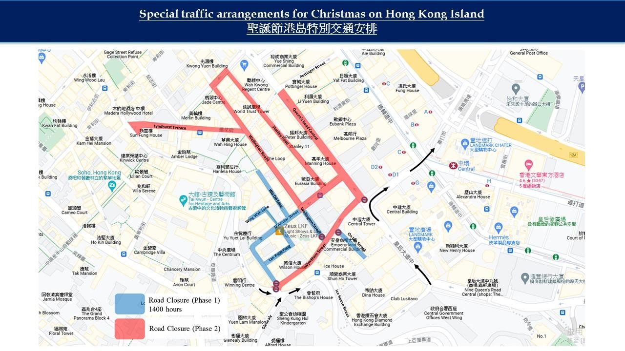 ●港島 下列道路將於24日下午2時至25日上午5時封閉: -介乎雲咸街與威靈頓街的德己立街; -蘭桂坊; -榮華里; -和安里; -介乎雲咸街與德己立街的威靈頓街;及 -安蘭街。 視乎人潮情況,下列道路或會封閉: -介乎德己立街與閣麟街的士丹利街; -介乎己連拿利與皇后大道中的雲咸街; -介乎皇后大道中與威靈頓街的德己立街; -介乎德己立街與閣麟街的威靈頓街; -介乎威靈頓街與士丹利街的閣麟街; -擺花街;及 -介乎畢打街與砵典乍街的皇后大道中。 在交通改道措施完成後,警方將指示人群沿皇后大道中、德己立街、士丹利街、閣麟街及威靈頓街輪候。整條德己立街將會禁止車輛駛入。為方便市民於子夜彌撒後離開聖若瑟堂,介乎堅尼地道與上亞厘畢道的花園道最右線將因應彌撒後的人流情況隨時封閉,供行人使用。 位於以下道路的所有路旁停車位,將於24日下午1時至25日上午5時暫停使用: -近德己立街的士丹利街; -安蘭街;及 -介乎亞畢諾道與德己立街的雲咸街。