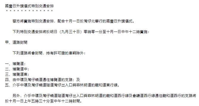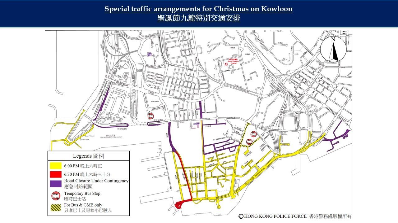 在上述封路期間,下列的交通改道將會實施: -沿紅磡道南行的車輛須由紅磡繞道駛至暢通路南迴旋處; -沿都會道東行的車輛不准右轉入紅磡繞道南行; -沿紅磡繞道南行的車輛須右轉入都會道西行; -沿暢運道西行往漆咸道南的車輛須右轉入漆咸道南北行或直駛往柯士甸道西行,專營巴士及專線小巴除外; - 所有彌敦道南行的專營巴士須右轉入眾坊街西行或佐敦道西行; -所有漆咸道南南行的專營巴士及專線小巴須左轉入加連威老道東行; -沿佐敦道西行的車輛不准左轉入廣東道南行,車輛須直駛往雅翔道方向或左轉入匯民道南行; -沿廣東道南行的車輛須於中港城對出掉頭駛入廣東道北行; -沿九龍公園徑北行的車輛不准左轉入廣東道南行; -沿梳士巴利道東行的車輛須左轉入九龍公園徑北行; -沿九龍公園徑北行的車輛不准右轉入北京道; -介乎彌敦道與加拿分道的加連威老道西行線將改為東行逆線行車,沿彌敦道南行的車輛將經指示左轉入加連威老道東行; -沿科學館道行駛的車輛不准轉入麼地道及加連威老道; -沿梳士巴利道南行近康莊道的車輛須駛往尖東;及 -沿加連威老道東行的車輛須左轉入漆咸道南北行。 第二階段(24日下午6時30分起) 下列道路將會封閉: -介乎廣東道與梳士巴利道的九龍公園徑北行線; -介乎廣東道與九龍公園徑的梳士巴利道東行線及西行線;及 -天星碼頭巴士總站。 如有需要,下列道路亦會封閉: -介乎佐敦道與柯士甸道的彌敦道南行線及北行線; -介乎庇利金街與彌敦道的寶靈街東行線; -介乎德興街與彌敦道的德成街東行線; -介乎柯士甸道與加連威老道的彌敦道南行線; -松山道; -山林道; -介乎金巴利道與加連威老道的加拿分道; -信義街; -嘉蘭圍; -介乎天文臺道與加連威老道的漆咸道南北行線; -介乎彌敦道與天文臺道的金巴利道; -金巴利街; -介乎彌敦道與漆咸道南的加連威老道; -介乎柯士甸道與九龍公園徑的廣東道南行線及北行線; -柯士甸道西西行線掉頭往柯士甸道西東行線的柯士甸道西掉頭支路; -往柯士甸道西迴旋處的柯士甸道西第一線; -介乎柯士甸道西入口及博物館道出入口的柯士甸道西迴旋處; -介乎佐敦道與柯士甸道西的雅翔道南行線及北行線; -柯士甸道西東行線掉頭往柯士甸道西西行線的柯士甸道西掉頭支路; -介乎華信街與紅樂道的紅鸞道; -愛景街;及 -建灣街。 在上述封路期間,下列的交通改道將會實施: -沿彌敦道南行的車輛須右轉入佐敦道西行; -沿佐敦道西行的車輛不准左轉入彌敦道南行; -沿柯士甸道西行及覺士道南行的車輛不准駛入松山道; -沿天文臺道行駛的車輛不准駛入金巴利街西行; -沿庇利金街北行的車輛不准右轉入寶靈街東行; -沿寶靈街東行的車輛須左轉入庇利金街北行; -沿廣東道南行的車輛不准直駛,車輛須左轉入柯士甸道東行或右轉入柯士甸道西西行; -沿柯士甸道西東行的車輛不准右轉,車輛須左轉入廣東道北行或直駛往柯士甸道東行; -沿柯士甸道西東行及西行的車輛不准駛入柯士甸道西支路; -沿佐敦道西行的車輛左轉入雅翔道南行後須轉入九龍站公共運輸交匯處; -沿柯士甸道西西行的車輛須直駛往雅翔道高架道路; -沿雅翔道南行駛入柯士甸道西迴旋處的車輛須左轉入柯士甸道西東行; -沿紅鸞道西行的車輛須左轉入華信街; -沿華信街行駛的車輛須右轉入紅鸞道東行; -沿紅樂道南行的車輛不准左轉入紅鸞道東行;及 -沿紅鸞道東行的車輛須左轉入紅樂道北行。 在上述封路範圍內的停車場將暫停使用,直至道路重開為止。以上特別交通安排實施期間,所有違例停泊的車輛將會在沒有事前警告的情況下被拖走或被重複票控。 警方會視乎該區當時的交通及人潮情況實施上述交通安排。駕車人士應保持忍讓,並遵從現場警務人員的指示。 運輸署亦呼籲市民盡量使用公共運輸服務,以避免交通擠塞及不必要的延誤。運輸署及警方會密切留意交通情況,並會在有需要時採取適當措施。警方將視乎各區當時的人潮及交通情況,調整有關交通安排。 (完) 【編輯:孟宜君】