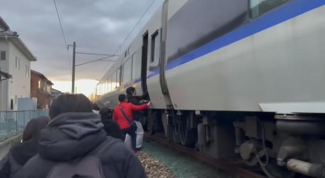 乘客在途中下車 受訪者供圖 中國游客 乘坐電車遇強震,跳下車在軌道附近空地避險 地震發生時,來自中國的譚女士和丈夫正乘坐電車前往大阪。他們於2023年12月30日前往日本石川縣金澤旅游。 2024年1月1日下午4點上電車幾分鐘後,列車車廂內便開始響起地震警報,“警報說地震馬上就要來了,大家做好準備,警報響了不到一分鐘,就開始有明顯的晃動,整個車廂都在左右晃,感覺像馬上要脫軌一樣。” 譚女士稱,第一次地震時,電車還晃著繼續開,因為慣性滑行了一會才停下。車停下後,列車播報遭遇了地震,讓乘客在原位置等待通知。震感持續了一兩分鐘,半小時內發生了兩次餘震。乘客都坐在自己的位置上,沒有人受傷。“第一次廣播說的是電車即將再開,讓我們做好準備,第二次廣播就開始問車廂里有沒有警察、消防員,說讓去集合開會。第三次廣播就是通知大家只帶著隨身物品下車。我們把行李箱都丟在車上了,不知道什麼時候能取到。”由於電車停下的位置距離海岸線不遠,震後發生了海嘯,工作人員建議譚女士不要自行回到車上去拿行李。 列車停下的位置沒有站台,乘客從約一米高的車上跳下來,在軌道邊的空地上避難。“這里的氣溫只有兩三度,室外很冷,我們等了大概兩個小時。”隨後,老人兒童等前往附近的消防署避難,其餘乘客則步行了十多分鐘,於晚上7時許抵達白山市立凑小學校的體育館。“我們走的小路,不知道他們公路的受損情況,沿途都是獨院住宅,看起來都有人,亮著燈。”譚女士說,體育館內除了乘客還有當地的居民,約有避難人員兩百人。 正逢新年,當地商鋪還在放假,買不到東西。列車員和消防員分發了陸續送來的食物和水。“物資都是老弱病殘優先,我和我老公的位置比較遠,所以一直沒有領到。”晚上10點,譚女士夫婦領到了礦泉水和飯糰。拿到過夜的物資後不久,當地再次發生餘震,“現在黑燈瞎火的也不敢走,只能在這里過夜了,學校的體育館比較安全。” 而在新潟縣讀書的留學生楊女士表示,地震發生時她正在自己的住處休息,收到地震預警後不久就感受到了強烈震感。“很多鄰居都跑到室外了。”楊女士所在的新潟縣震度為“6”,僅次於震中。 “地震後,我這里的燃氣斷了,水電沒有什麼問題。沿海有3米的海嘯,這里海岸線主要是一條國道,不知道有沒有受損,看新聞里很多高速公路封路了。”晚上8時許,楊女士回到了住處。 當地現狀 3萬多戶停電,一核電站燃料池水溢出 當地時間1月1日下午5時,日本內閣官房長官林芳正在緊急記者會上稱,日方正在確認人員和財產損失,目前沒有接到日本境內任何核電站工作異常的報告。 “石川縣的志賀核電站變壓器起火,目前已被撲滅,未對核電站造成影響”。他還表示,對於居住在沿海地區的人們來說,躲避即將到來的海嘯至關重要,記者會上還提示,地震區域民眾注意未來一周內,特別是未來兩三天內,再次發生震度7左右地震的可能性。 強震發生後,日本氣象廳向石川縣能登地區發佈了大海嘯警報,目前預計海嘯最大高度或達5米。當天晚間,日本氣象廳已將石川縣能登地區的大海嘯警報更改為海嘯警報。大海嘯警報在海嘯高度最高超過3米時發佈,海嘯警報則在超過1米時發佈。 日本廣播協會等媒體呼籲民眾立刻從危險區域撤離。日本東海道新幹線東京站至小田原站區間,以及豐橋站至新神戶站區間暫時停運。北陸電力公司發佈消息稱,目前石川縣和富山縣有超過3.6萬戶家庭斷電。東北電力公司表示,新潟縣內約3600戶家庭斷電。 據中國駐大阪總領館的消息,目前暫無中國公民在此次地震中傷亡的報告。 據財聯社1日22時58分報道,日媒報道東京電力公司稱,已確認地震導致新瀉縣柏崎刈羽核電站2號、3號、6號和7號機組反應堆建築物頂層燃料池水溢出。目前尚無法證實建築物外有洩漏或損壞。東京電力公司稱,在當地時間下午6點45分左右檢查機組燃料池時,發現2號機組溢出約10升水,3號機組溢出0.46升水,6號機組溢出600升水,7號機組溢出4升水。這些水含有放射性物質,目前正在檢測其放射性水平。(完) 【編輯:紀東】