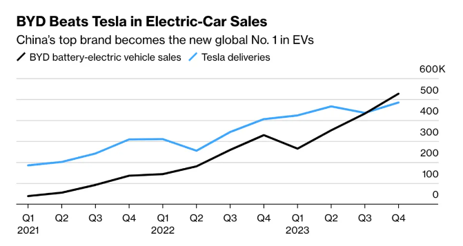 香港新聞網1月3日電 當地時間2日晚間,特斯拉公佈了2023年第四季度汽車產量和交付量。數據顯示,在2023年最後一個季度交付了484507輛電動汽車。這是特斯拉第一次排名第二,而中國品牌比亞迪登頂第一。 據特斯拉公佈的數據,2023年第四季度汽車交付量為484,507輛,超過市場預計的483,173輛。2023年全年車輛交付同比增長38%,達到181萬輛,產量同比增長35%,達到185萬輛,產銷量均創史上新高。 儘管數據很不錯,但也遇到了來自比亞迪的挑戰。據報道,比亞迪在2023年第四季度銷售了超過52.6萬輛純電動汽車,而特斯拉同期的銷量接近48.5萬輛。