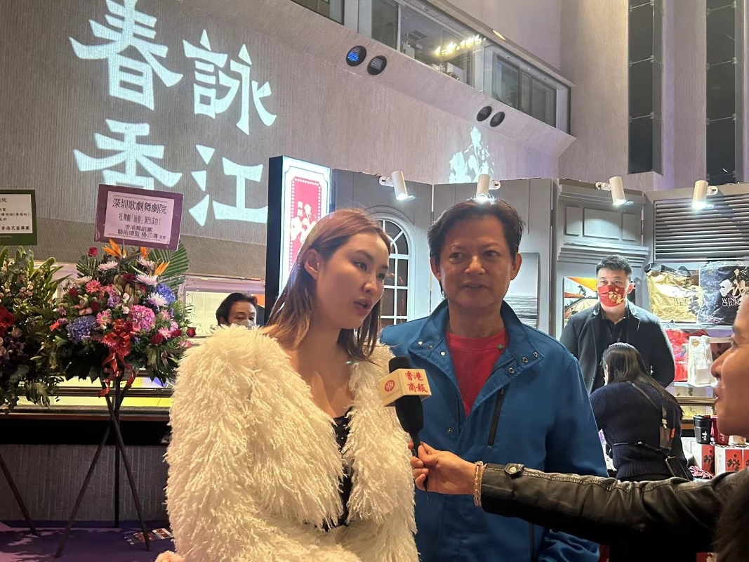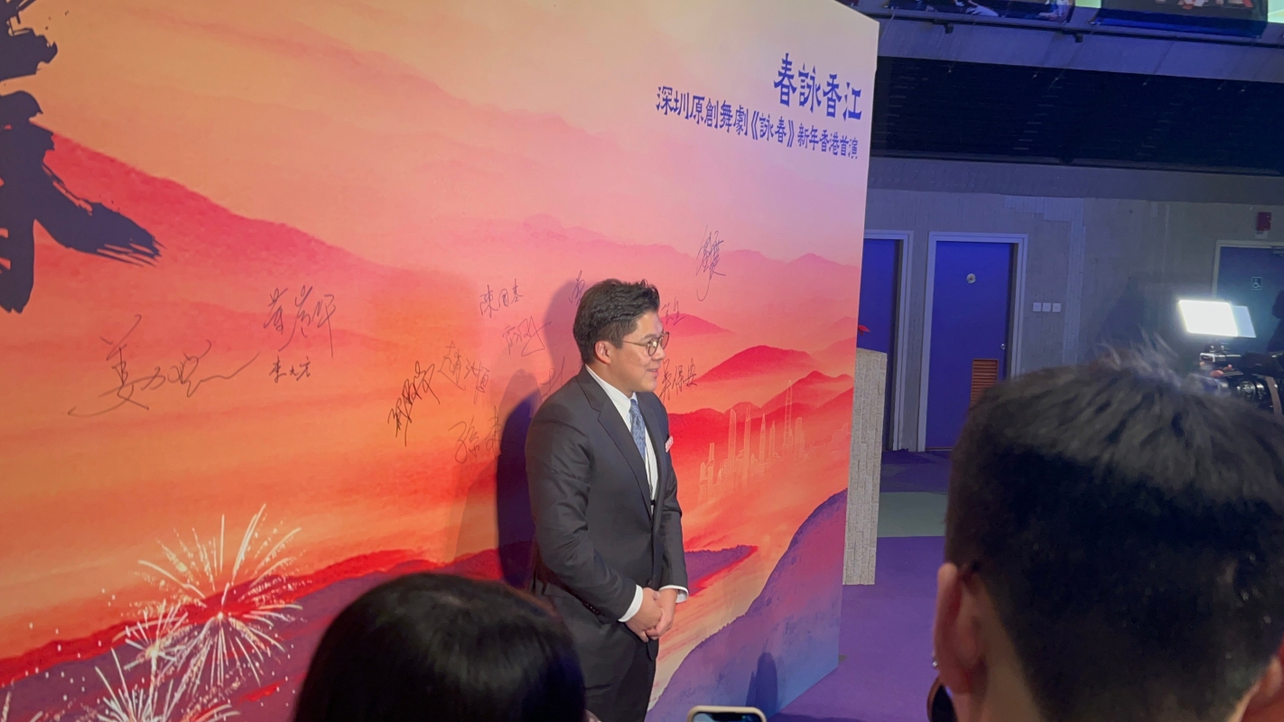 嘉賓雲集預祝《詠春》首演圓滿成功。香港中通社圖片 (徐嘉儀攝) 現場播放短視頻《詠春·追光》拉開序幕,“英雄站在光裡,而我們願是那束光。”《詠春》之光點亮了劇中人,也點亮了現場觀眾。前來看劇的不僅有市民,還有不少電影明星,紛紛舉起手機自拍打卡。香港藝術發展局主席、立法會議員霍啟剛之前特意去深圳看《詠春》。他在香港首演現場接受中通社記者採訪表示,舞劇除了編舞很美,也傳遞出很多層次的中華文化內涵,亦演繹了香港與內地多年來血濃於水、交流交往的故事。