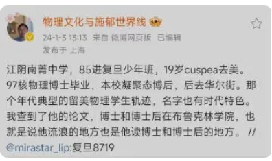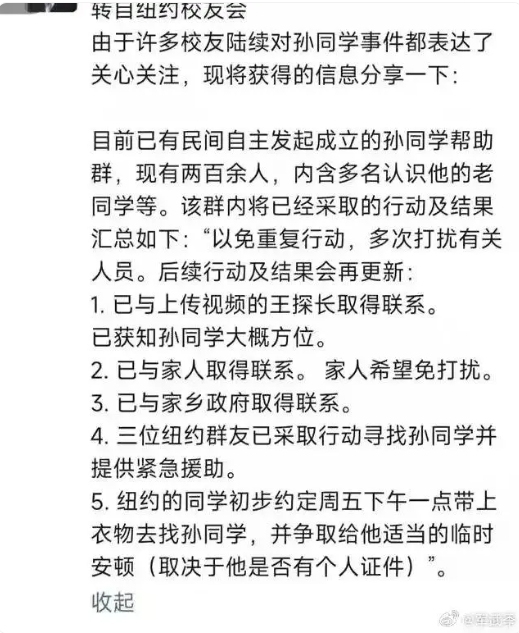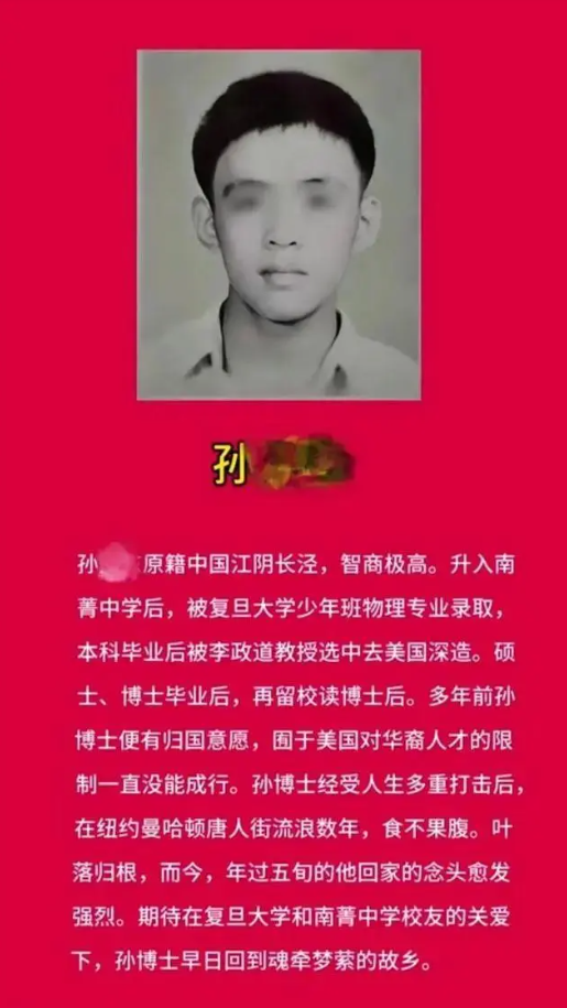 江陰市當地救助機構更新的動態(圖片來源:網絡) 1月4日下午,有江陰市當地的救助機構發佈了孫某在美國的視頻稱,孫某原籍江陰市長涇鎮,智商極高。升入南菁中學後,被復旦大學少年班物理專業錄取,本科畢業後被李政道教授選中去美國深造,碩士、博士畢業後,再留校讀博士後。多年前,孫博士便有歸國意願,囿於美國對華裔人才的限制一直沒能成行。孫博士經受人生多重打擊後,在紐約曼哈頓唐人街流浪數年,食不果腹。而今,年過五旬的他回家的念頭愈發強烈,期待在復旦大學和南菁中學校友的關愛下,孫博士早日回到魂牽夢縈的故鄉。5日,該救助機構一名相關負責人告訴記者,相關信息屬實。 據紅星新聞報道,1月5日上午,復旦大學美國校友會(紐約)聯絡人向記者確認了該男子的身份,并表示目前復旦大學在紐約的校友們正積極想辦法為他提供幫助,“我們校友會目前可以確認他的確是復旦校友。現在已有紐約當地復旦校友自發的志願者行動,但目前還未取得直接聯繫。”