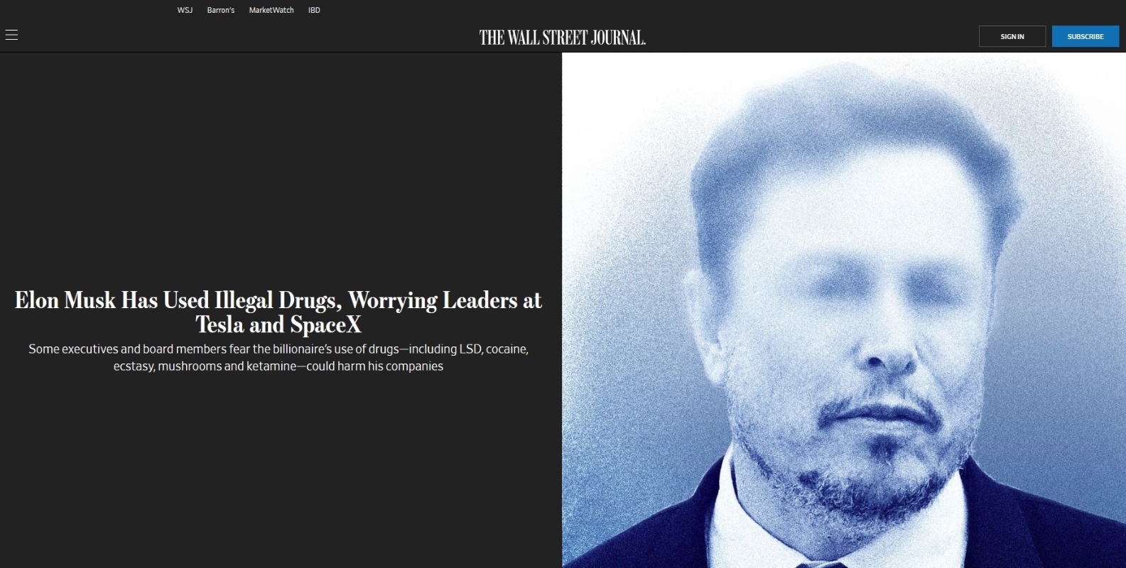 《華爾街日報》報道截圖 據中國新聞網引述《華爾街日報》報道,目睹馬斯克吸毒的人士和其他知情人士稱,馬斯克經常在世界各地的私人聚會上使用致幻劑、可卡因、搖頭丸等毒品。在這些聚會上,參加者必須簽署保密協議或不帶手機才能進入。據稱,馬斯克此前還曾在公共場合吸過大麻,并表示他有類似迷幻劑氯胺酮的處方。 知情人士稱,多年來,特斯拉的一些董事會成員一直在談論他們對馬斯克涉嫌吸毒的擔憂。據稱,特斯拉前董事琳達·約翰遜·賴斯(Linda Johnson Rice)對馬斯克反複無常的行為感到非常沮喪,并對他吸毒感到擔憂,因此她沒有競選連任2019年公司董事會。 據熟悉馬斯克和這些公司的人士透露,馬斯克吸毒不僅可能對他的健康產生重大影響,還會對他所監管的六家公司和數十億資產產生重大影響。 報道指出,馬斯克使用非法藥物可能違反美國聯邦政策,可能危及SpaceX數十億美元的政府合同,也可能會讓投資者持有的約1萬億美元資產、數以萬計的就業機會以及其公司與美國政府合作的太空計劃面臨風險。