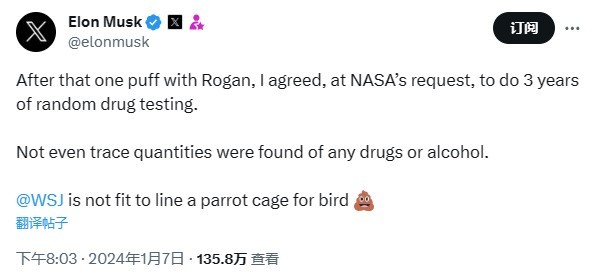 馬斯克社交媒體截圖 當地時間7日,馬斯克在社交媒體平台X(原推特)上發文否認使用非法藥物。 他聲稱,在與喜劇演員喬·羅根(Joe Rogan)吸了一口(大麻煙)之後,他同意應美國國家航空航天局(NASA)的要求,進行為期3年的隨機藥物測試,期間未發現任何微量的毒品或酒精。 【編輯:梅婉潼】