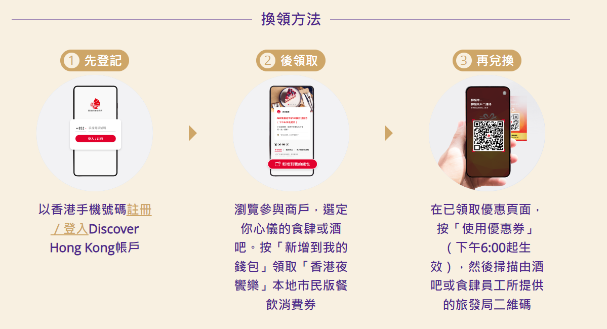 (香港中通社資料圖) 第二批“香港夜饗樂”本地市民版餐飲消費券參與的食肆包括港式煲仔菜﹑地道麵食及粥品﹑米芝蓮星級粵菜食府﹑海鮮酒家﹑重慶火鍋﹑美式快餐﹑連鎖炸雞店﹑少女系Café﹑高質法國菜﹑意大利菜﹑東南亞菜﹑日韓菜等,亦有多間人氣時尚酒吧。 香港新聞網整理了消費劵的換領方法及注意事項,方便市民領取。 1,【先登記】 以香港手機號碼註冊或登入Discover Hong Kong 帳戶。 2,【後領取】 瀏覽參與商戶,選定你心儀的食肆或酒吧。按“新增到我的錢包”領取“香港夜饗樂”本地市民版餐飲消費券。 3,【再兌換】 在已領取優惠頁面,按“使用優惠券”(下午6:00起生效),然後掃描由酒吧或食肆員工所提供的旅發局二維碼。